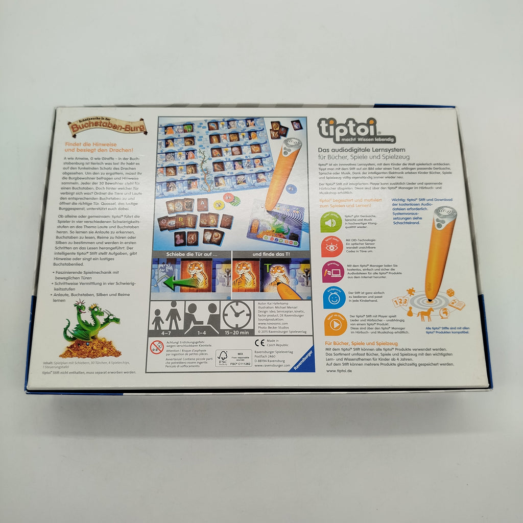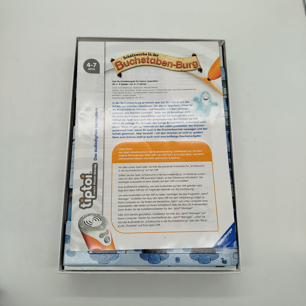 Hol dir das Lernspiel Schatzsuche in der Buchstaben-Burg von Ravensburger tiptoi und entdecke spielerisch die Welt der Buchstaben. Dieses interaktive Brettspiel vermittelt Wissen zu Buchstaben, Silben und Reimen und ist für 1 bis 4 Spieler geeignet. Das Spielbrett, 30 Plättchen und 4 Spielfiguren sind enthalten. Der tiptoi Stift wird separat benötigt. Die Spielzeit beträgt etwa 15 bis 20 Minuten. Das Spiel befindet sich in gutem gebrauchten Zustand mit leichten Gebrauchsspuren und wird in Originalverpackung geliefert. Die Vollständigkeit konnte nicht überprüft werden. Achtung: Nicht für Kinder unter 3 Jahren geeignet, da Kleinteile verschluckt werden können.