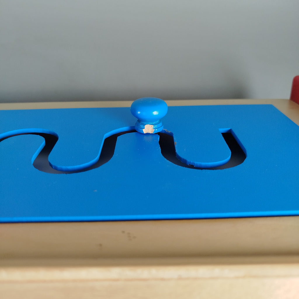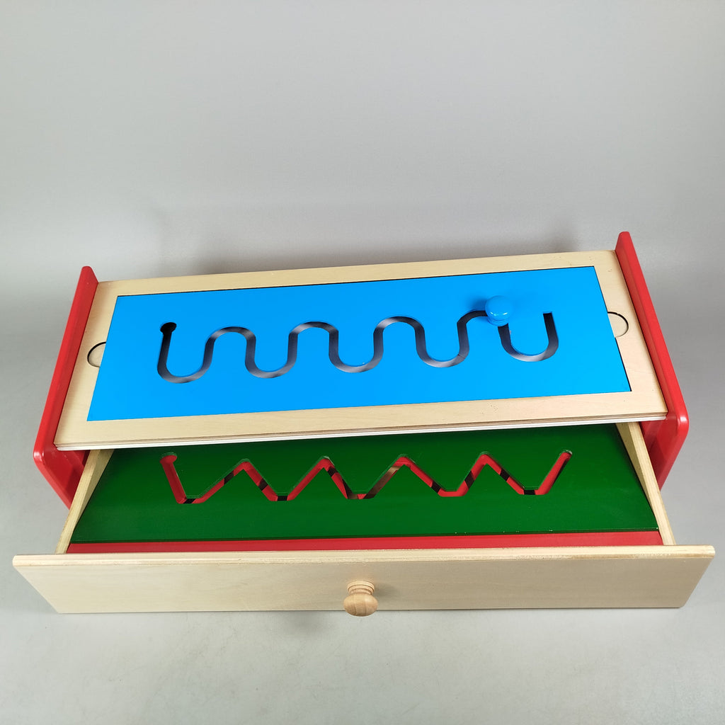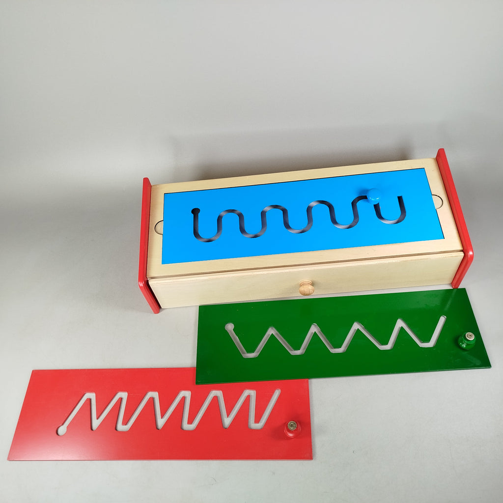 Grafomotorik-Stiftführungsbrett aus Holz für ökologisches Spielvergnügen. Das Brett verfügt über eine weiße Oberfläche mit drei austauschbaren Farbplatten: blau mit gebogenem Pfad, grün mit breitem Zickzack und rot mit scharfem Zickzack. Jede Platte besitzt einen farblich abgestimmten Knauf zum Nachzeichnen der Wege, was gezielt die grafomotorischen Fähigkeiten fördert. Altersempfehlung: 3–5 Jahre. Achtung: Nicht für Kinder unter 3 Jahren geeignet.