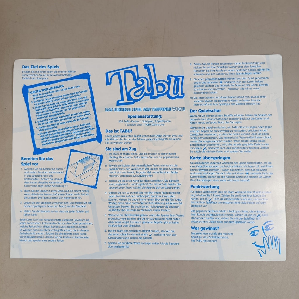 Hol dir das beliebte Hasbro Gesellschaftsspiel Tabu für spannende Teamrunden mit Freunden und Familie! Dieses Partyspiel enthält 252 Karten, Spielplan, 2 Spielfiguren, Sanduhr und den kultigen TABU-Quietscheer. Ideal für 4 oder mehr Spieler ab 12 Jahren. Das Spiel befindet sich in neuwertigem Zustand in Originalverpackung. Gib diesem Klassiker ein neues Zuhause und erlebe unvergessliche Spielabende!