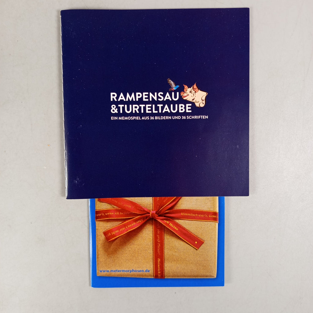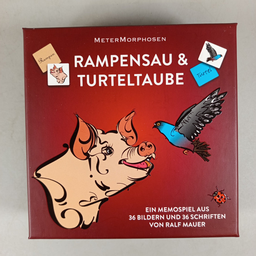 Hol dir das originelle Memospiel Rampensau & Turteltaube von MeterMorphosen und trainiere dein Gedächtnis mit 36 Bild- und 36 Textkarten von Ralf Mauer. Perfekt für humorvolle Spielrunden oder als Geschenk für Sprachliebhaber. Das Spiel ist vollständig, in sehr gutem Zustand und in deutscher Sprache. Gib diesem Spiel ein neues Zuhause und fördere nachhaltiges Spielen!