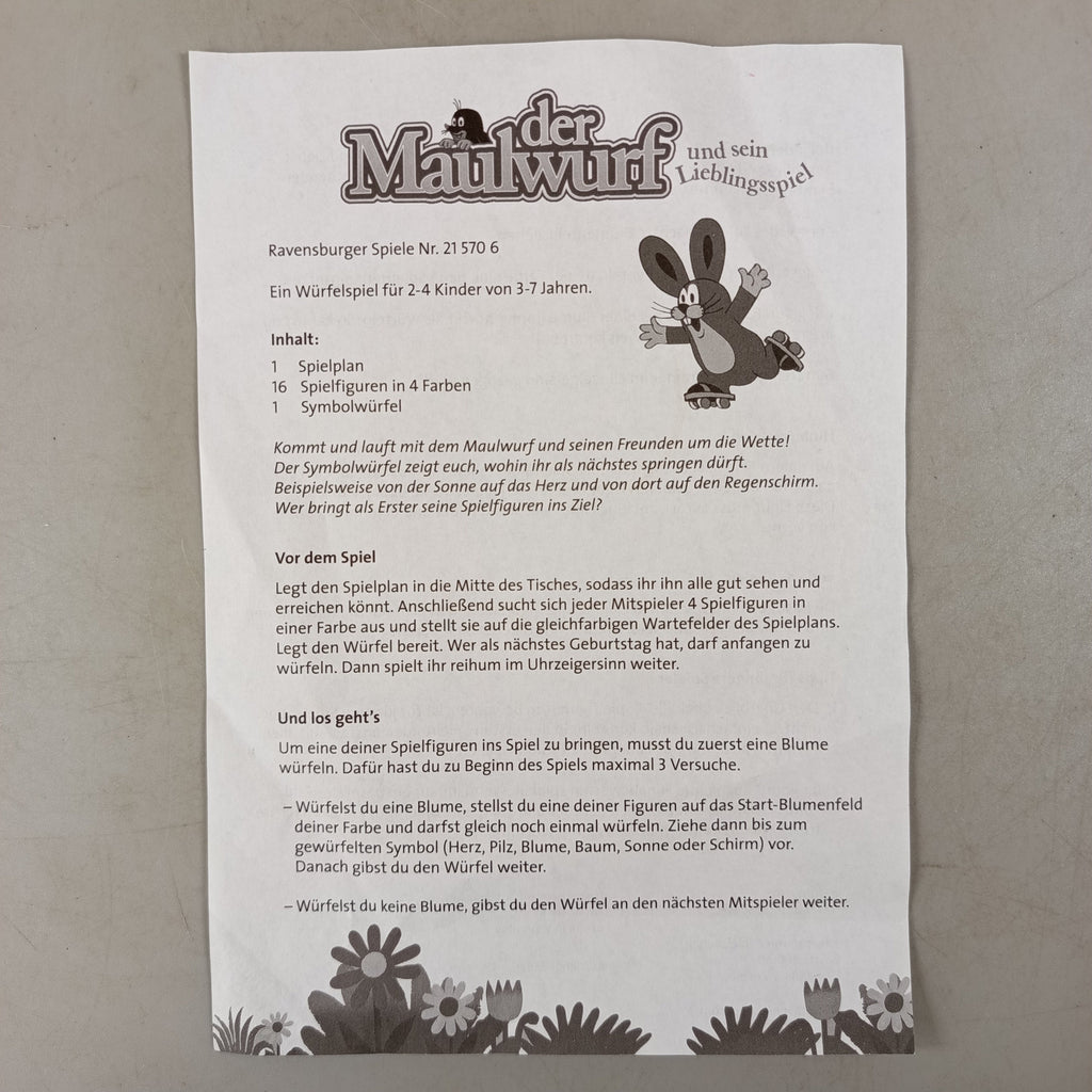Hol dir das lustige Brettspiel „Der Maulwurf und sein Lieblingsspiel“ aus der Serie „Meine ersten Spiele“ von Ravensburger. Dieses Spiel ist für 2–4 Spieler ab 3 Jahren geeignet und enthält 1 Spielplan, 16 Spielfiguren in 4 Farben und 1 Symbolwürfel. Die Anleitung ist auf Deutsch enthalten. Das Spiel befindet sich in einem sehr guten gebrauchten Zustand mit nur leichten Gebrauchsspuren und kommt in Originalverpackung. Gib diesem nachhaltigen Spiel ein neues Zuhause und fördere spielerisch die Konzentration und das Erkennen von Symbolen.