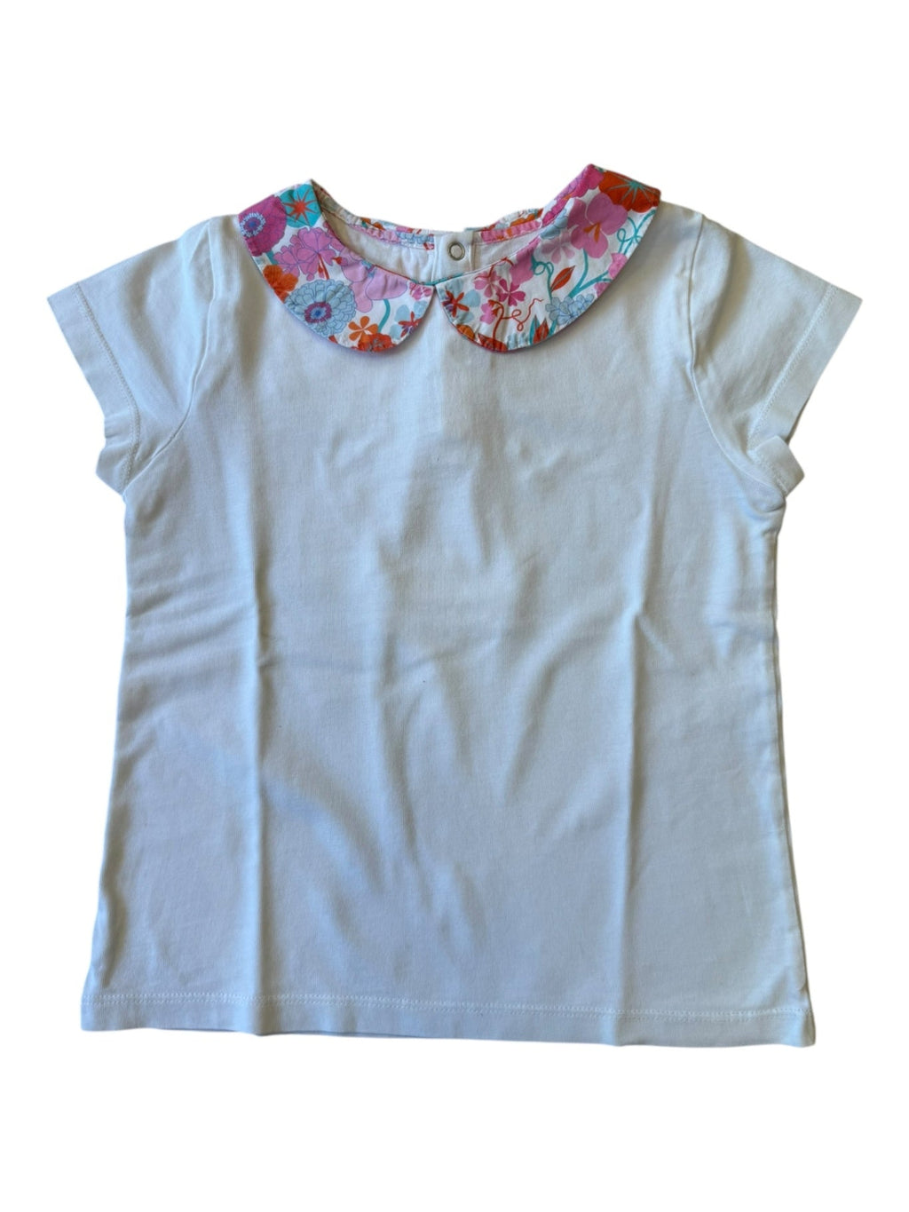 Kinder-Secondhand-T-Shirt von Jacadi. Der weiße Stoff mit dem floralen Bubi-Kragen verleiht dem Oberteil eine verspielte und zugleich klassische Note.
