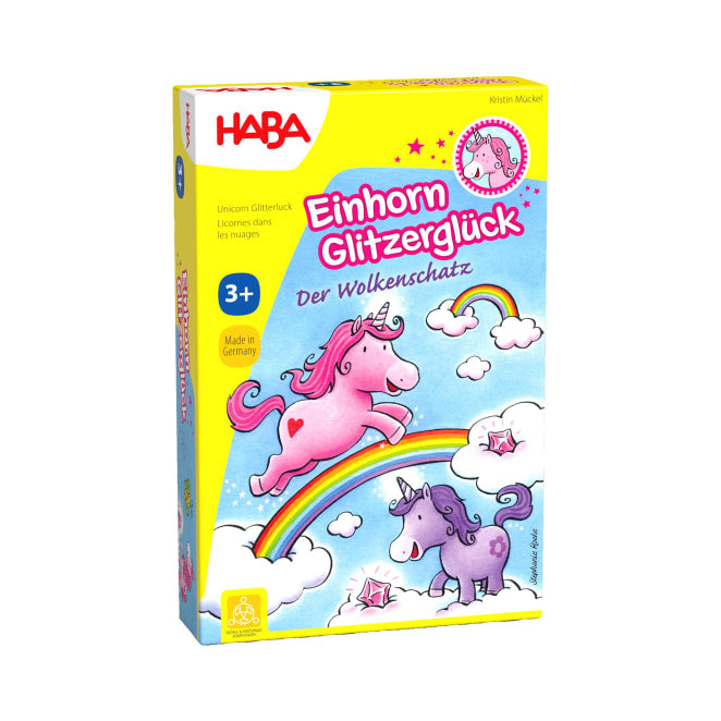 Die vier Einhörner Glitzerglück, Sternenstaub, Wunderblume und Zauberwirbel leben im weit entfernten Wolkenland und sind die besten Freunde. Ausgelassen galoppieren sie über die weichen Wattewölkchen, rutschen die bunten Regenbogen hinunter oder spielen mit den funkelnden rosa Wolkenkristallen. Da zieht plötzlich ein Gewitter auf! Schnell fliehen die Einhörner vor den dunklen Wolken in Richtung Sonne. Auf dem Weg dorthin wollen sie noch so viele Wolkenkristalle wie möglich vor dem Unwetter in Sicherheit bringen. Welches Kind kann seinem Einhorn helfen? Die einfachen Regeln sind schnell vorgelesen und schon kann das Würfel-Laufspiel losgehen. Wer mit seiner Einhorn-Spielfigur zuerst an der Sonnenwolke ankommt und auf dem Weg die meisten Wolkenkristalle eingesammelt hat, kann dieses liebevoll gestaltete Spiel gewinnen.