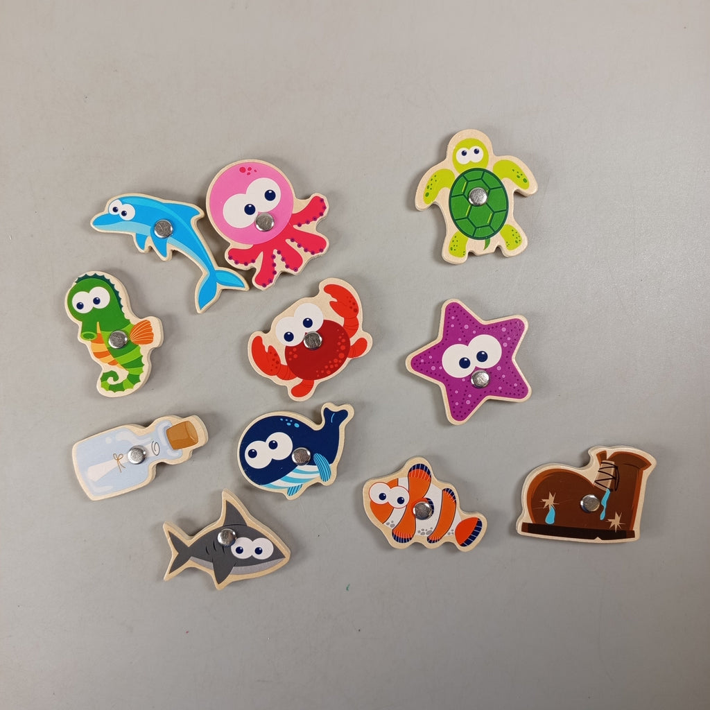 Hol dir das farbenfrohe Angelspiel aus Holz und entdecke den Spaß am Fischen! Dieses Set enthält 2 Angelruten und 12 magnetische Meerestiere mit eingebauten Metallelementen. Einige Figuren sind nummeriert und fördern spielerisch das Zählen und die Hand-Auge-Koordination. Die Vollständigkeit konnte nicht überprüft werden, Verpackung fehlt. Das Spiel befindet sich in einem sehr guten gebrauchten Zustand. Sicherheitshinweis: Nicht für Kinder unter 3 Jahren geeignet, da Kleinteile verschluckt werden können.