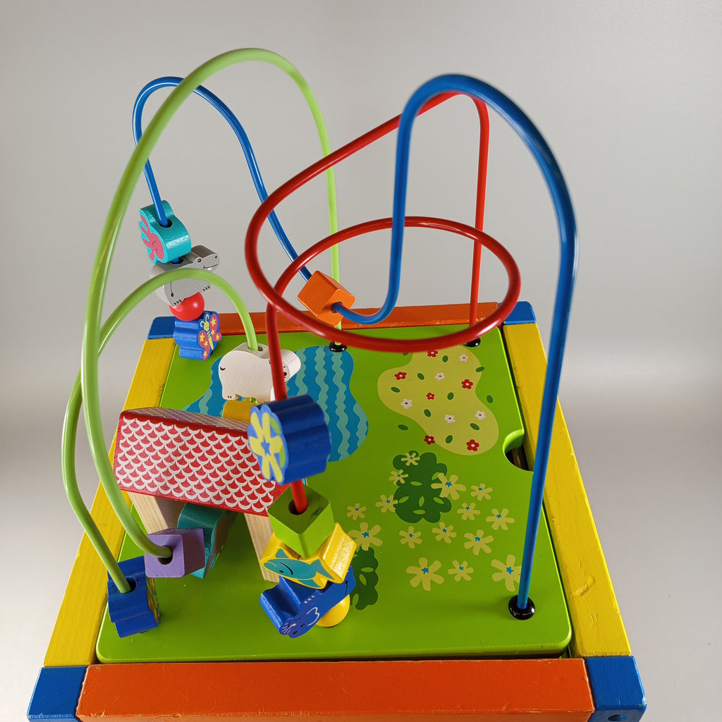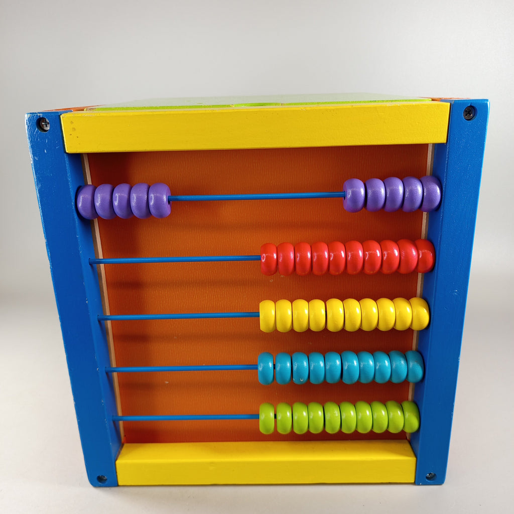 Hol dir den vielseitigen Holz Aktivitätswürfel und entdecke spielerisch neue Fähigkeiten! Der Würfel bietet fünf interaktive Seiten mit Xylophon, Rechenschieber, Schiebespiel, Tafel und einer Kugelbahn mit bunten Holzperlen. Ideal zur Förderung von Motorik, Kreativität und Farbverständnis. Gib diesem Spielzeug ein neues Zuhause und fördere nachhaltiges Spielen. Der Würfel ist vollständig und befindet sich in einem sehr guten gebrauchten Zustand.