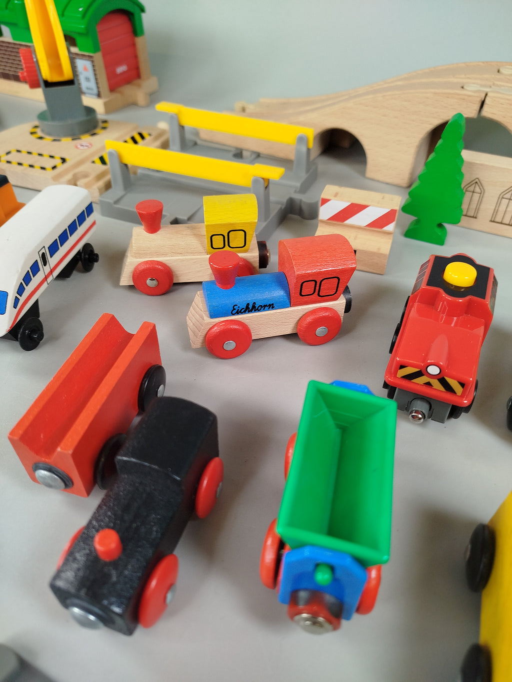 Hol dir das vielseitige Holzeisenbahnset und erweitere deine Spielwelt mit vielen liebevoll gestalteten Holzteilen. Enthalten sind verschiedene Züge, Waggons, Fahrzeuge und Schienen ergänzt durch Brücken, Kurven, eine Station und weiteres Zubehör von Marken wie Eichhorn und Brio. Die Teile bestehen aus robustem Holz, zeigen leichte Gebrauchsspuren und werden ohne Originalverpackung oder Anleitung geliefert. Gib diesem nachhaltigen Spielzeug ein neues Zuhause und entdecke grenzenlosen Spielspaß! Das Set befindet sich in einem guten gebrauchten Zustand. Hinweis: Die Vollständigkeit konnte nicht überprüft werden.