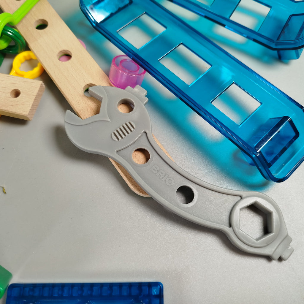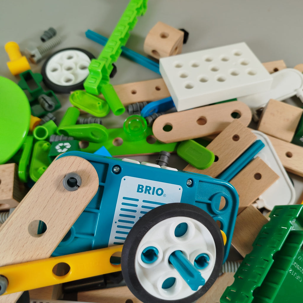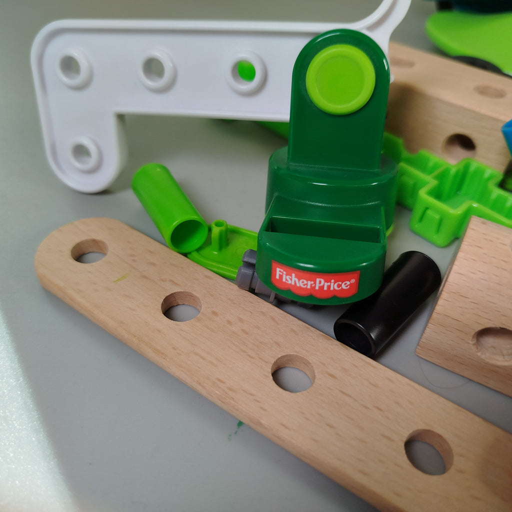 Hol dir das Konstruktionsspielzeug-Set von BRIO und Fisher-Price und bring Lernen und Spaß in den Alltag deiner Kinder! Dieses Set enthält verschiedene Holz- und Kunststoffteile wie perforierte Holzbalken, Räder, Achsen, Schrauben, Muttern sowie durchsichtige blaue Platten. Es färdert logisches Denken und Feinmotorik bei Kindern. Gib diesem Spielzeug ein neues Zuhause und erlebe strahlende Kinderaugen! Es sind keine Originalverpackung oder Anleitungen enthalten und die Vollständigkeit konnte nicht überprüft werden. Der Zustand ist gut, jedoch sind kleinere Nutzungsspuren sichtbar. Achtung: Nicht geeignet für Kinder unter 3 Jahren aufgrund verschluckbarer Kleinteile.