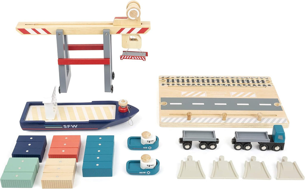 Produktbeschreibung Containerabfertigung der Extraklasse! Dieses Spielset aus FSC 100%-zertifiziertem Holz hat eine Menge Spielspaß für kleine Hafenmeister zu bieten. Die große Basisplatte kommt mit passenden Einkerbungen für den Schienenverkehr und einer rollenden Containerbrücke daher, die zudem einen vertikal und horizontal beweglichen Kran mit sich führt. Das Containerschiff wird mit Hilfe von zwei Schleppern an die Kaimauer gezogen und dort mit einer Schnur vertäut. Warnhinweise Kleine Teile. Erstickungsgefahr.