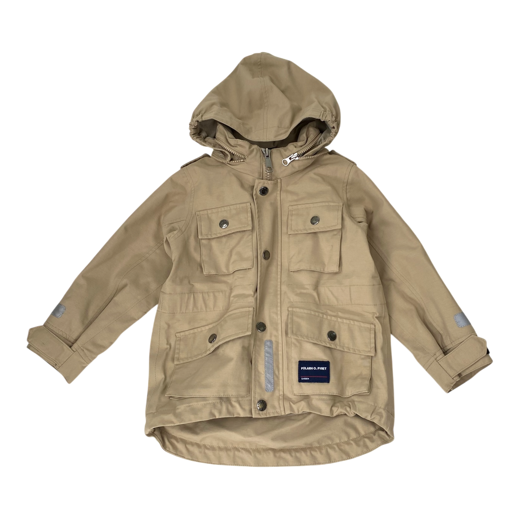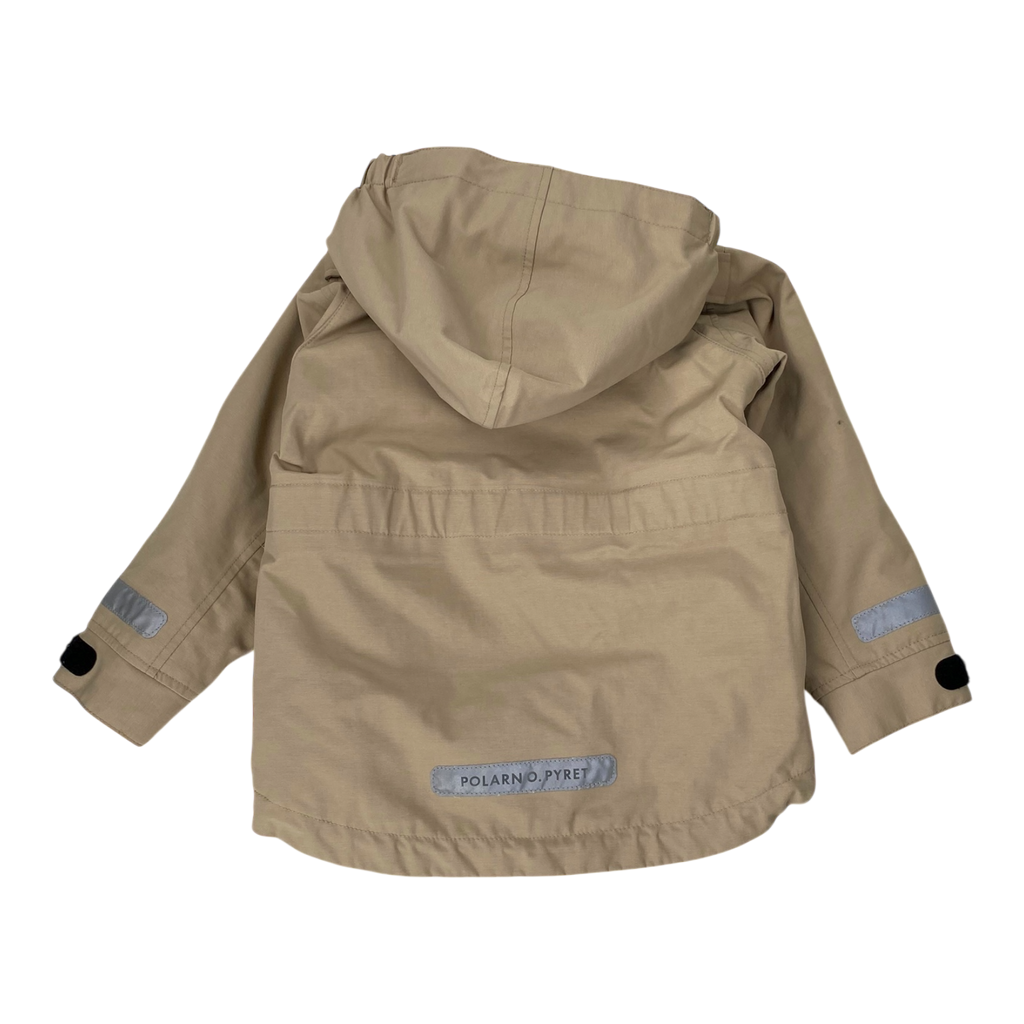Polarn O. Pyret midseason jacket with windproof and water resistance layers. Detachable hood and multiple pockets with snap buttons.