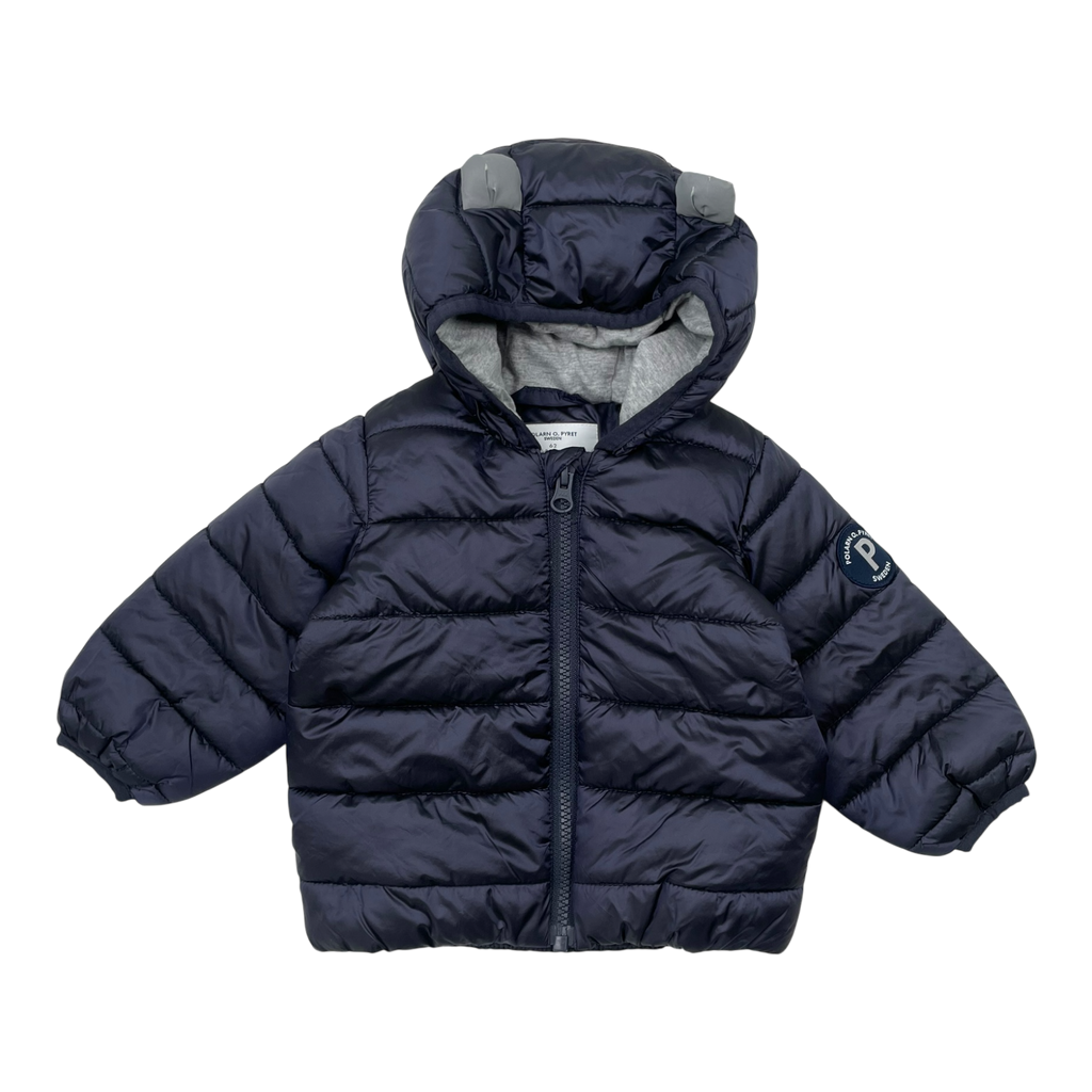 Polarn O. Pyret lightly padded puffer jacket with reflective bear ears on the hood.