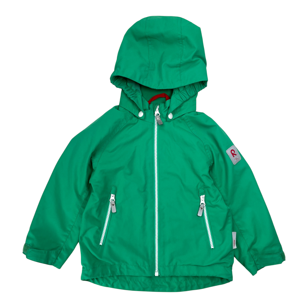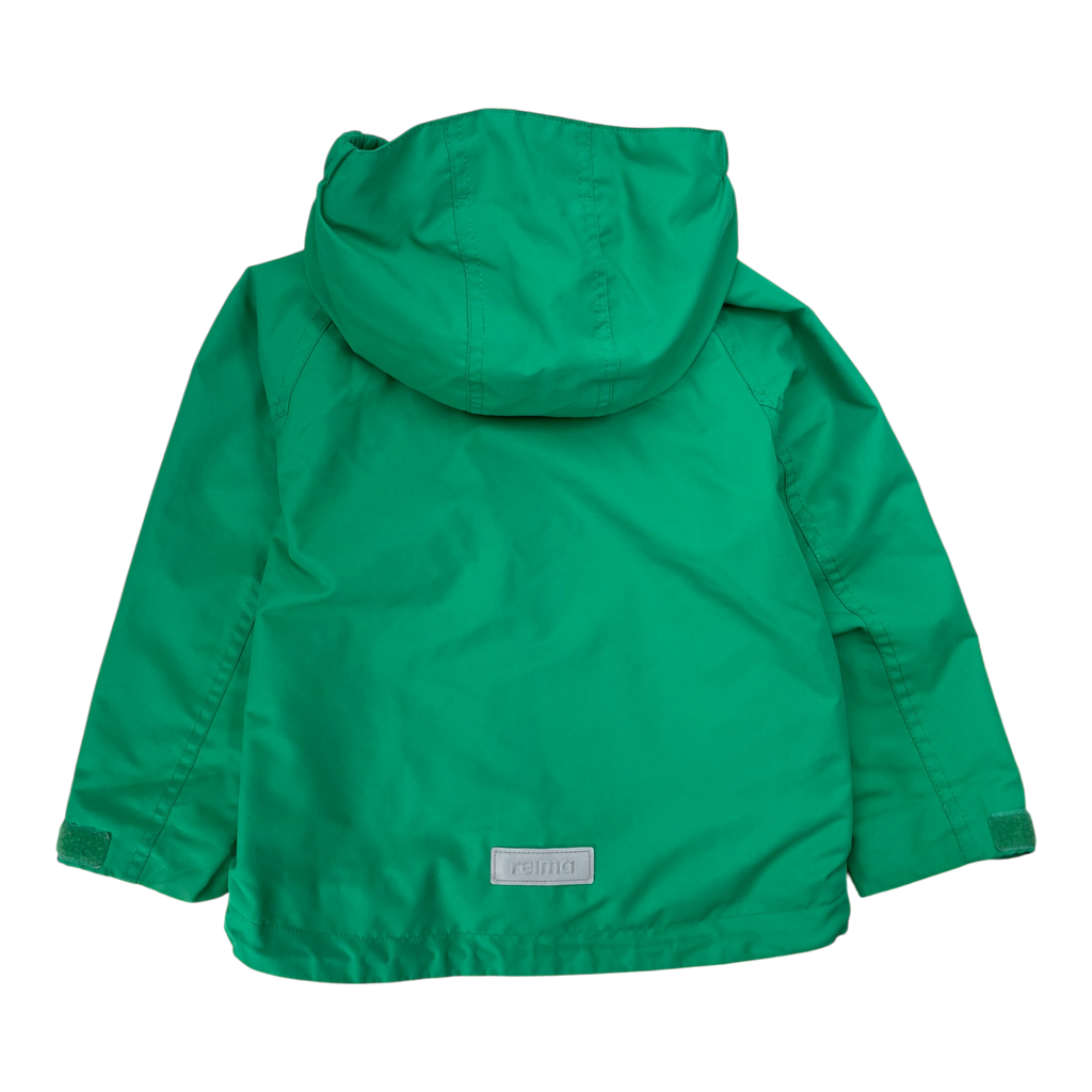 Reimatec Soutu jacket with a detachable hood, two zip pockets on the sides, and adjustable elastic at the hem. The material is originally waterproof and the seams are sealed.