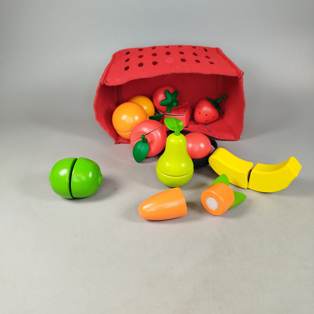 Hol dir das liebevoll gestaltete Holz-Spiellebensmittel-Set von IKEA und lade zum fantasievollen Rollenspiel in der Kinderküche ein! Das Set umfasst eine Geburtstagstorte mit sechs Stücken und fünf Kerzen, eine Pizza mit sechs Stücken und 18 Belägen, ein Schneidebrett mit Messer sowie einen roten Stoffkorb mit Obst und Gemüse zum Schneiden. Alle Teile bestehen aus stabilem Holz oder Stoff mit Klettverschlüssen und fördern die Feinmotorik sowie kreatives Spielen. Die Verpackung fehlt, das Spielzeug befindet sich in einem sehr guten gebrauchten Zustand. Hinweis: Nicht für Kinder unter 3 Jahren geeignet, Erstickungsgefahr durch Kleinteile. Gib diesem nachhaltigen Spielzeug ein zweites Zuhause und schenk es weiter Freude!