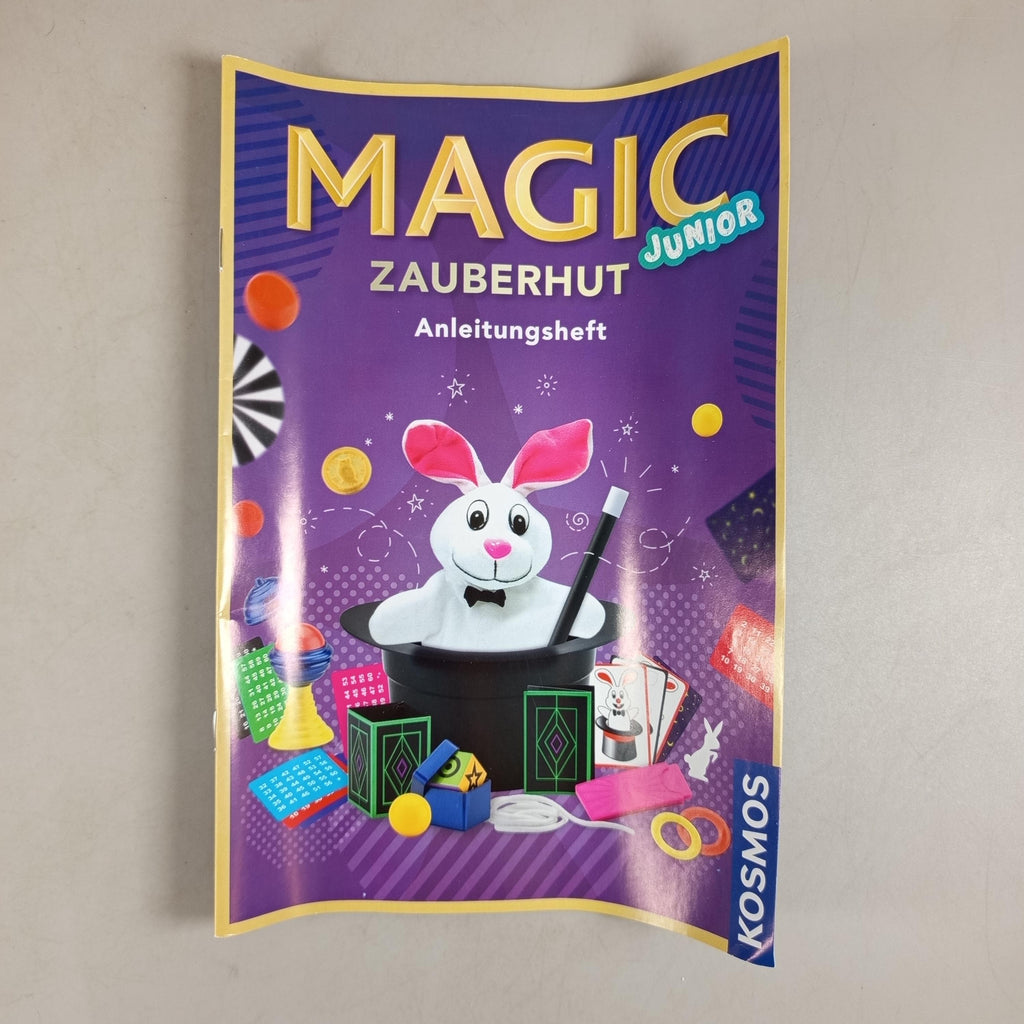 Hol dir das Magic Zauberhut Junior Zauberset von Kosmos und tauche in die Welt der Magie ein! Enthalten sind ein schwarzer Zauberhut, ein Plüschhase, ein Zauberstab, verschiedene Kunststoffrequisiten, Karten, Stickerbögen und ein weißes Seil. Das Set fördert Kreativität und Geschicklichkeit und bietet viele tolle Tricks zum Erlernen. Es befindet sich in gutem gebrauchten Zustand mit leichten Gebrauchsspuren, die Vollständigkeit konnte nicht überprüft werden. Inklusive originaler deutscher Anleitung.