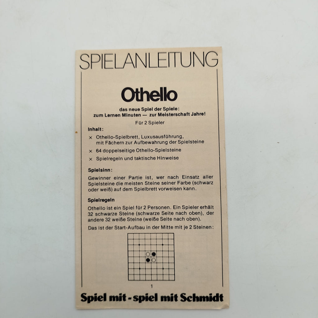 Hol dir das klassische Brettspiel Reversi & Othello von Schmidt International und fordere Freunde zu spannenden Duellen heraus. Enthalten sind ein Spielbrett mit Ablagefächern und 64 doppelseitige Spielsteine sowie eine deutschsprachige Anleitung mit Spielregeln und Taktiktipps. Die Verpackung zeigt leichte Gebrauchsspuren, das Spiel selbst befindet sich in gutem Zustand. Die Vollständigkeit konnte nicht überprüft werden. Perfekt für strategische Köpfe ab 6 Jahren.