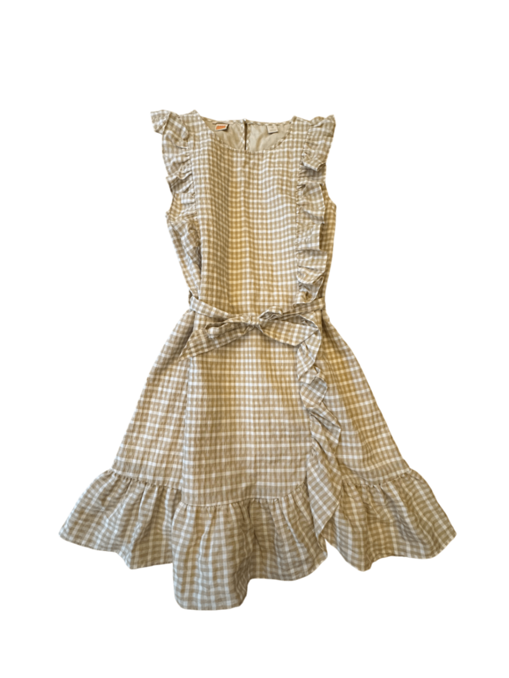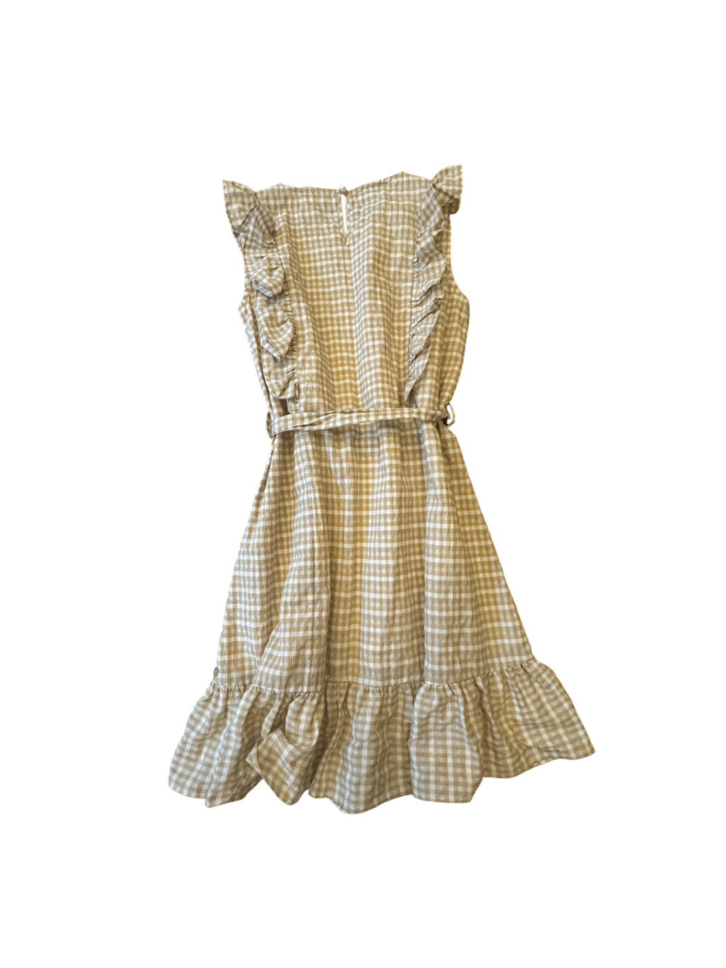 Dieses hübsche Mädchen-Secondhand-Kleid ist ein charmantes Stück mit einem klassischen Karo-Muster in Beige und Weiß. Du wirst das Design mit Rüschendetails an Ärmeln und Saum lieben. Das Kleid ist perfekt für warme Tage und kann sowohl lässig als auch schick kombiniert werden.