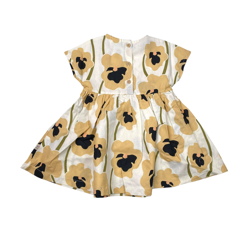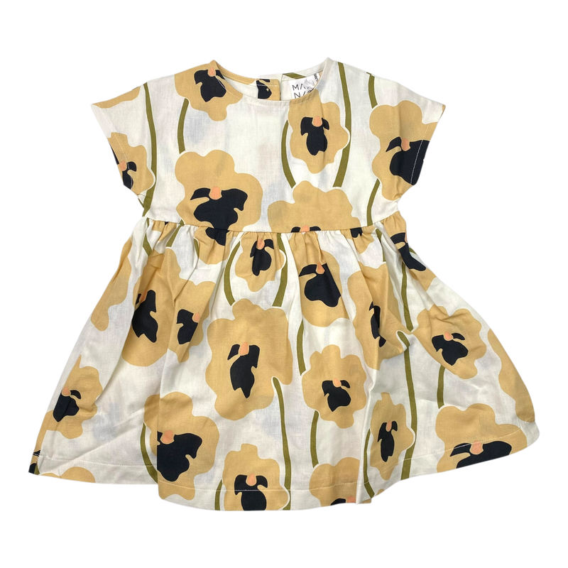 Mainio short sleeved dress in a viola print with buttons in the back.
