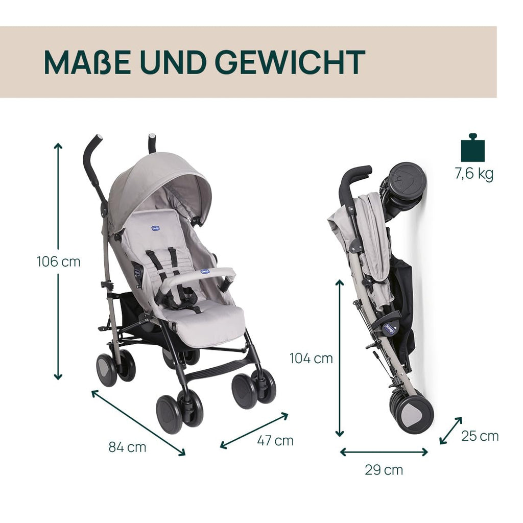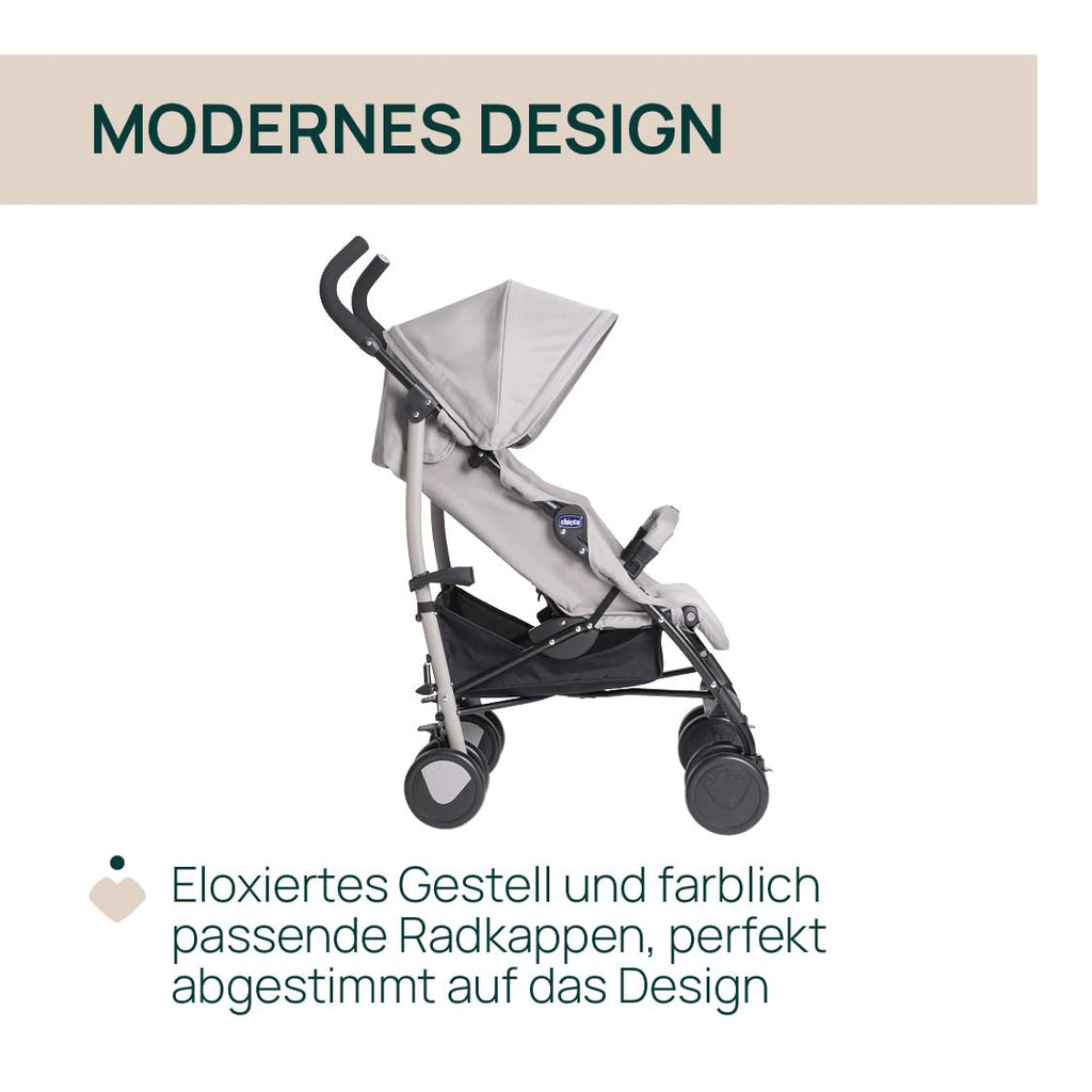 Chicco ECHO LITE ist der Kinderwagen mit dem lebendigen Charakter und dem erfrischenden Aussehen! Das farbenfrohe Gestell und die auf den Sitz abgestimmten Hinterräder machen den Echo zu einem modischen Kinderwagen mit einer starken Persönlichkeit: eine perfekte Mischung aus Stil und Funktionalität. Die Rückenlehne ist vollständig verstellbar und kann in 4 verschiedene Positionen gebracht werden. Auch die Fußstütze ist verstellbar. Mit seinem geräumigen Sitz und der gepolsterten Stoßstange ist der Echo Lite von Geburt an bis zu einem Gewicht von 22 kg zugelassen. Moderner, einfarbiger Look: Die farbigen Rohre und Radbezüge passen perfekt zu den Stoffen. Einfach zu bedienendes Regenschirm-Faltsystem. Echo Lite ist mit Zwillingsbremsen und schwenkbaren Vorderrädern ausgestattet.