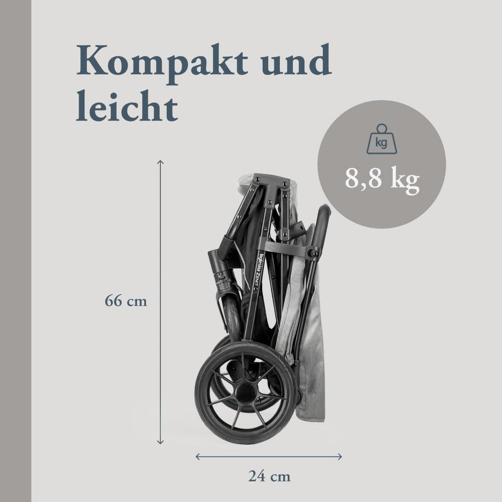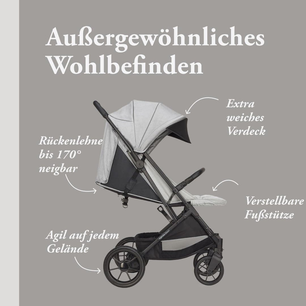 Kompakter Kinderwagen mit großartiger Leistung. Ideal für etwas größere Kinder bis zu 22 kg. Dank seiner Wendigkeit und großen Räder meistert er jedes Gelände; er ist kompakt, bietet aber gleichzeitig extremen Komfort für das Kind. Die Rückenlehne lässt sich von der aufrechten Position bis zur vollständig liegenden Position (170°) verstellen. Das Verdeck und der Bezug sind abnehmbar und können per Hand bei 30°C gewaschen werden. Das reflektierende Materialprofil des Korbs sorgt für mehr Sicherheit bei abendlichen Spaziergängen. Es gewährleistet eine ideale Luftzirkulation dank eines Belüftungsfensters, das an der Rückseite des Verdecks angebracht ist. REGENSCHUTZ INBEGRIFFEN.