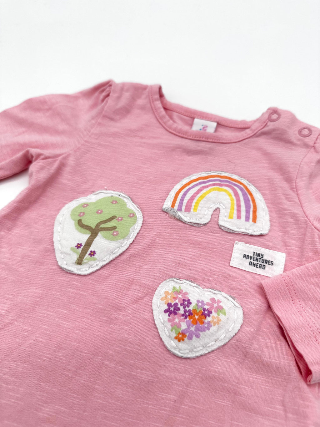 - Rosa Kleid mit niedlichen Applikationen (Regenbogen, Baum, Herz)
