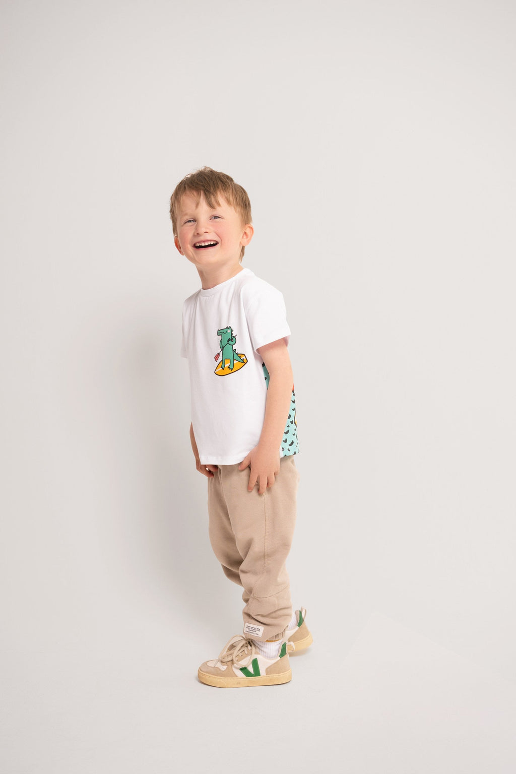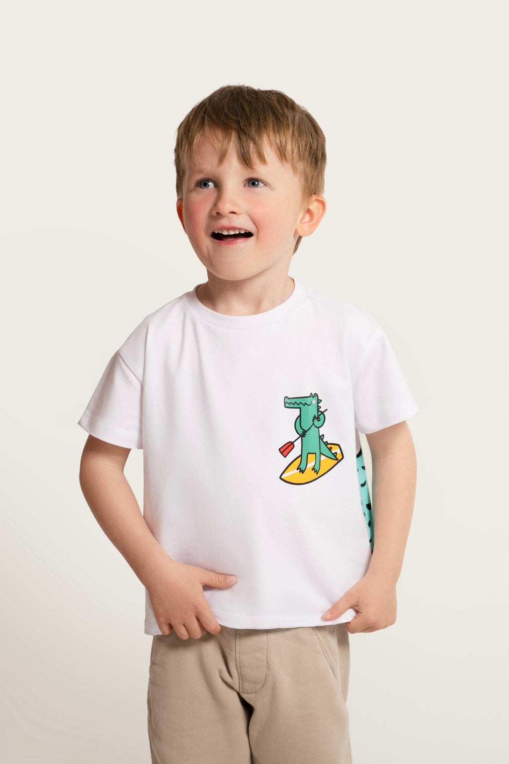 Dieses weiße Shirt bringt ordentlich Farbe ins Spiel! Das freche Krokodil zeigt sich im poppigen Paddel-Look – vorne klein, hinten groß und immer mit Style.