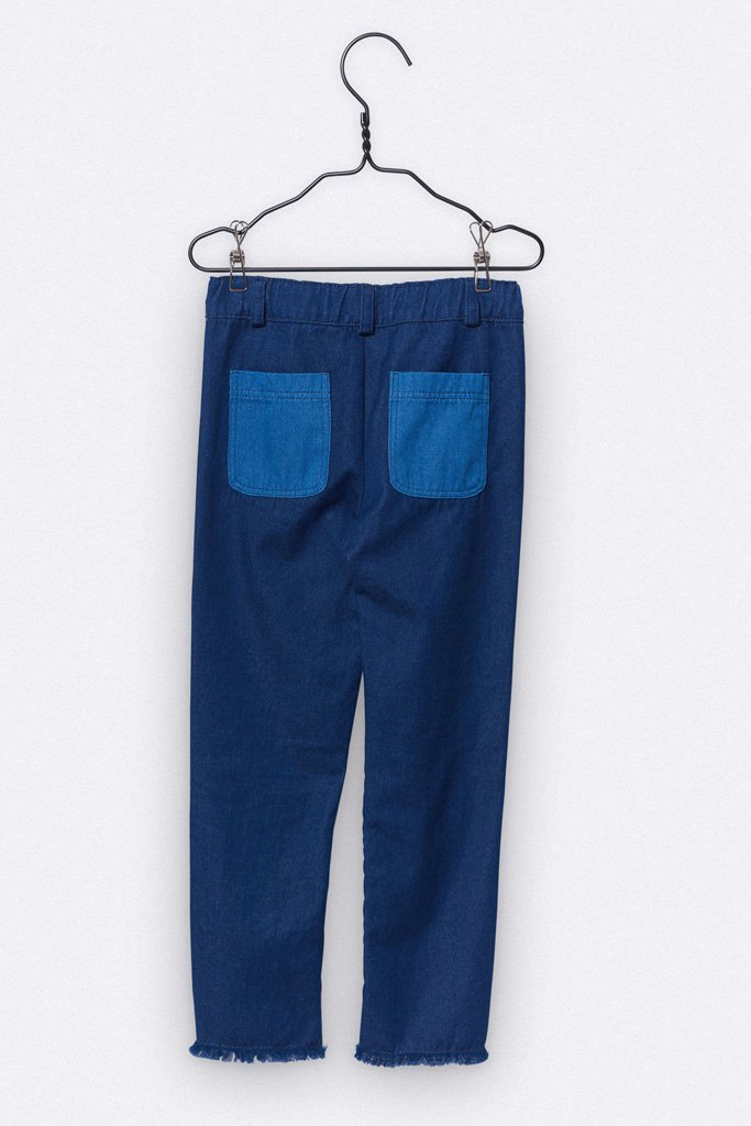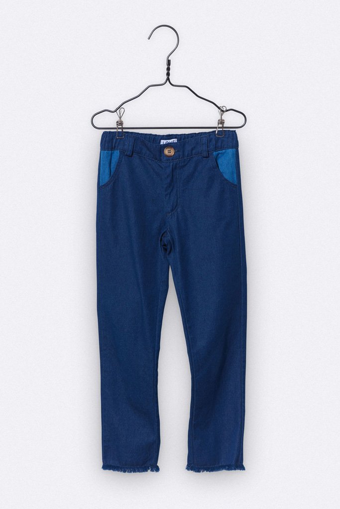 Dark blue jeans by Love Kidswear with a slim fit, frayed hem and contrasting pockets. A button on the waistband allows you to adjust the width.