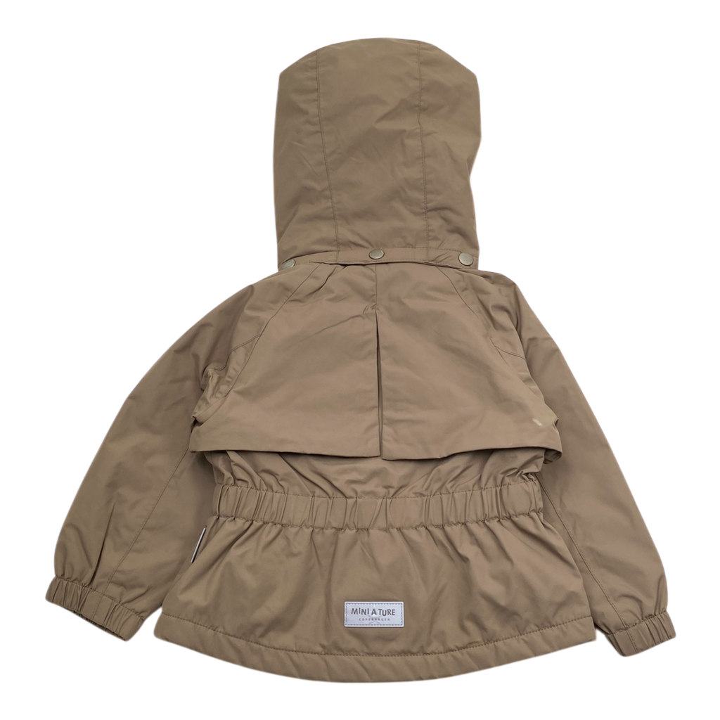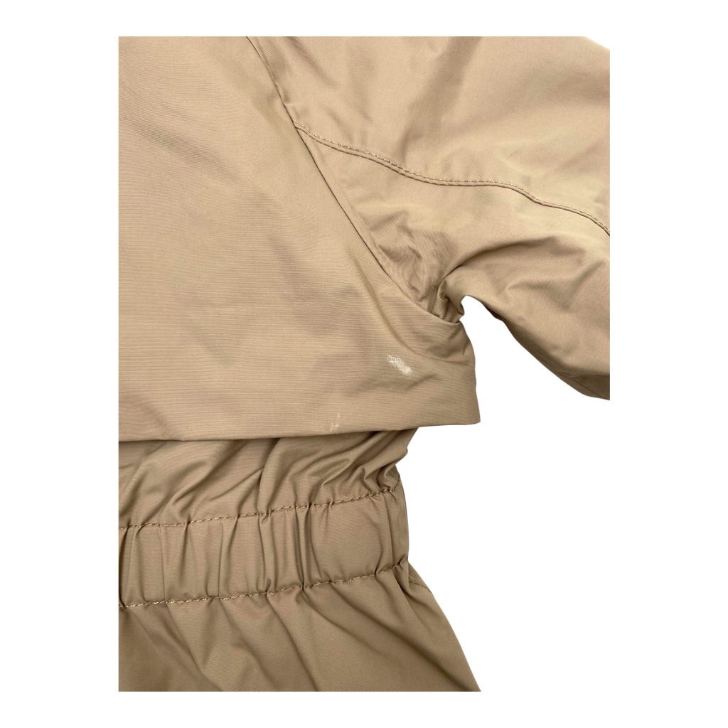 Mini A Ture Matalgea spring midseason jacket has a fleece lining inside. The jacket has a zipper closure in the front, two front pockets, ribbed cuffs and a reflecting logo on the back. The item has a stain.