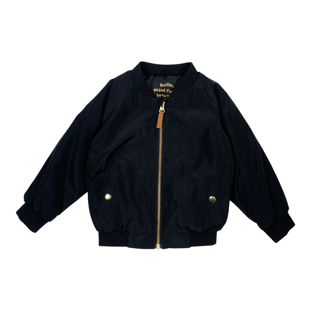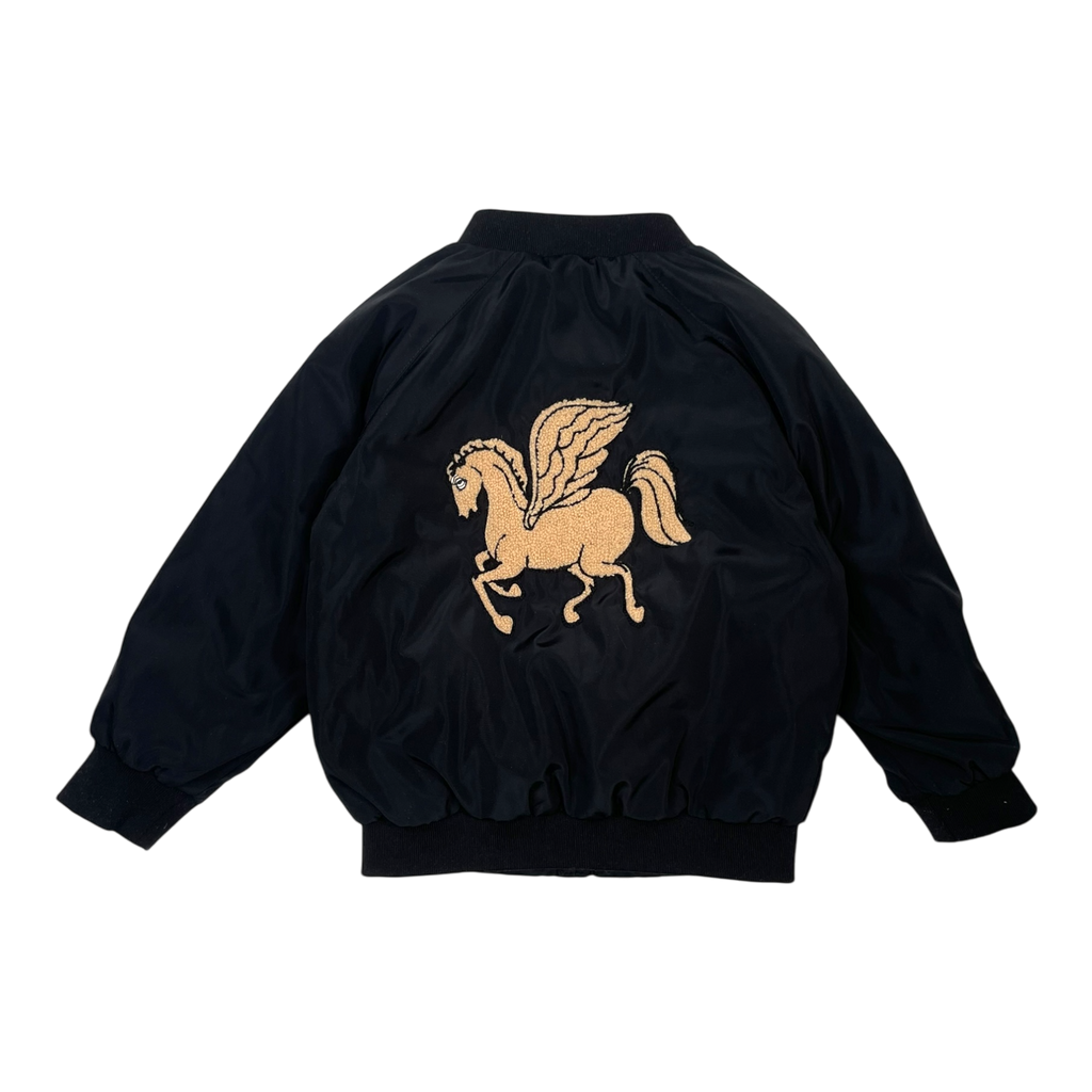 Mini Rodini bomber jacket with zipper and pockets. The jacket is lightly padded. Horse embroidery on the back.