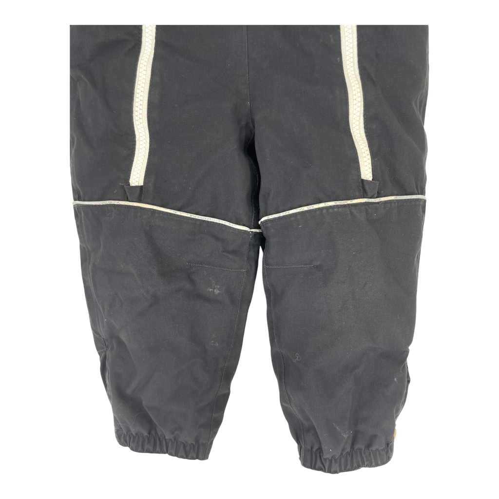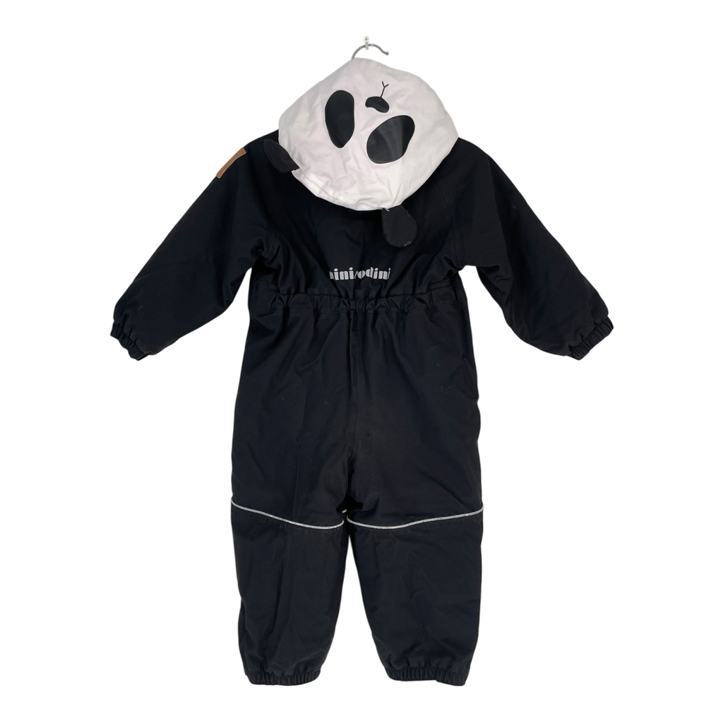 Mini Rodini padded black water- and windproof baby snowsuit with a removable panda-hood. The snowsuit has pre-shaped legs and raglan sleeves for better movability as well as double zips for easy dressing. The smartly placed reflectors increase visibility when the days get darker.