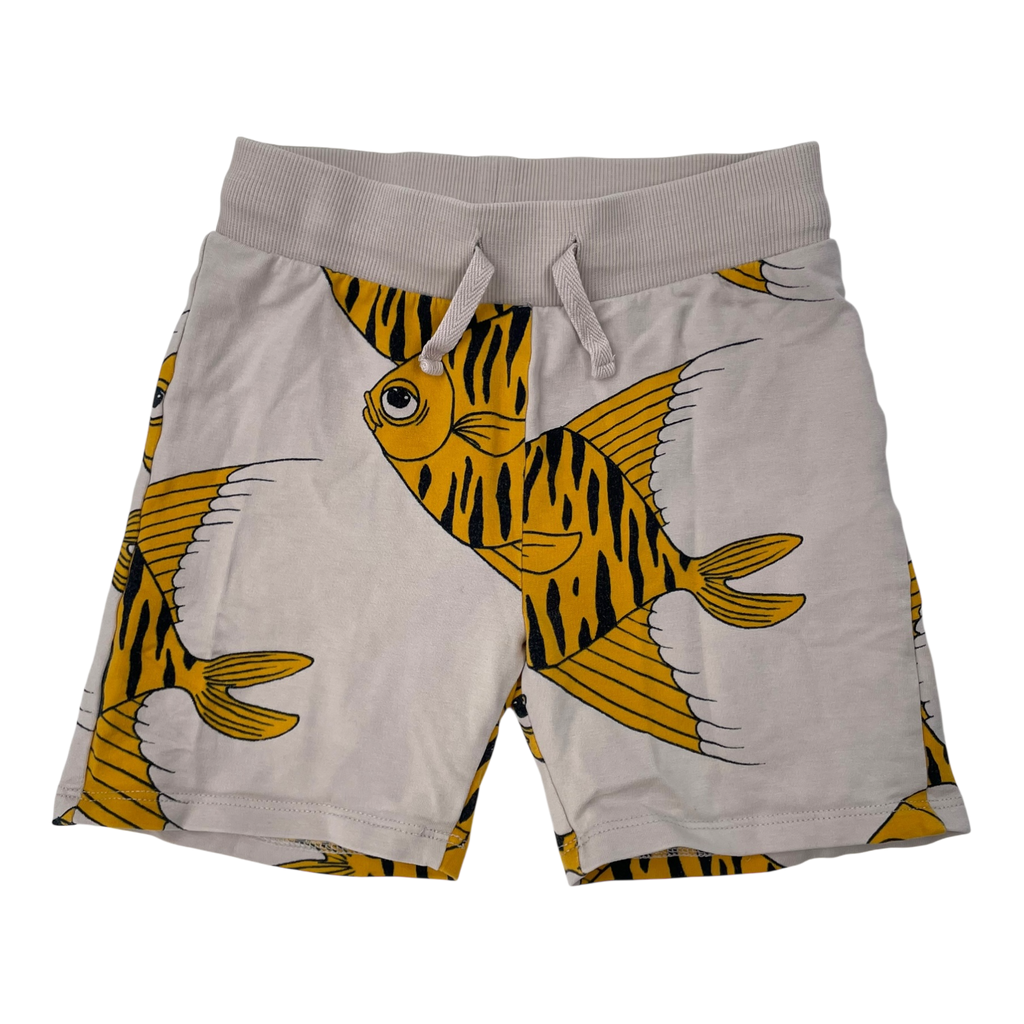 Mini Rodini sweat shorts with drawstrings to adjust the waist in fish print.