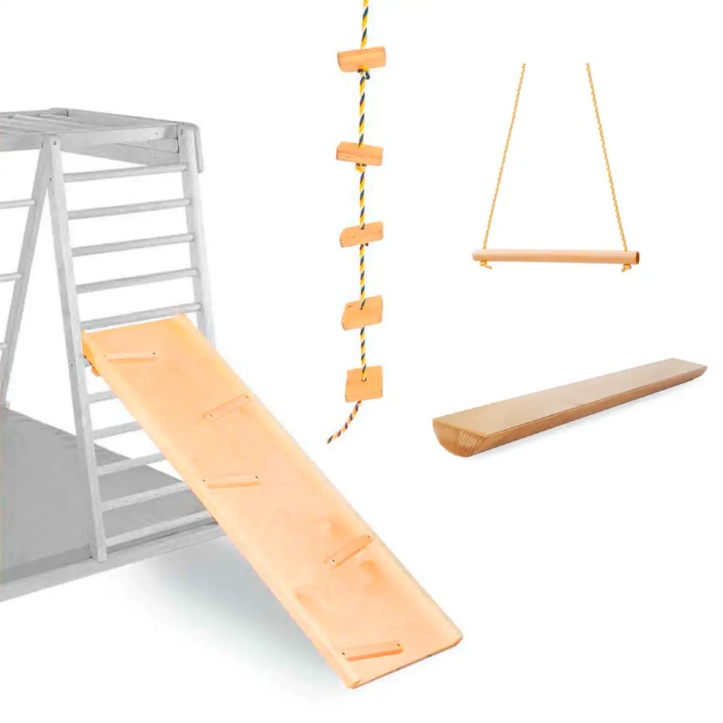 Dieses Zubehörset Sport ist die optimale Ergänzung zu jedem Kidwood Klettergerüst! Dein Kind wird es lieben! Im Set sind enthalten sind eine doppelseitige Rutsche, ein Holztrapez, ein Kletterseil mit Aufstiegshilfen und ein Balancebalken.