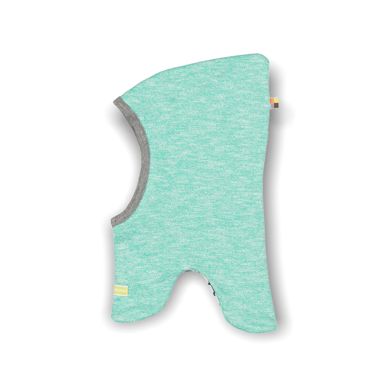 Reversible balaclava from Loud + Proud in the color jade melange. The other side has a blue penguin pattern.