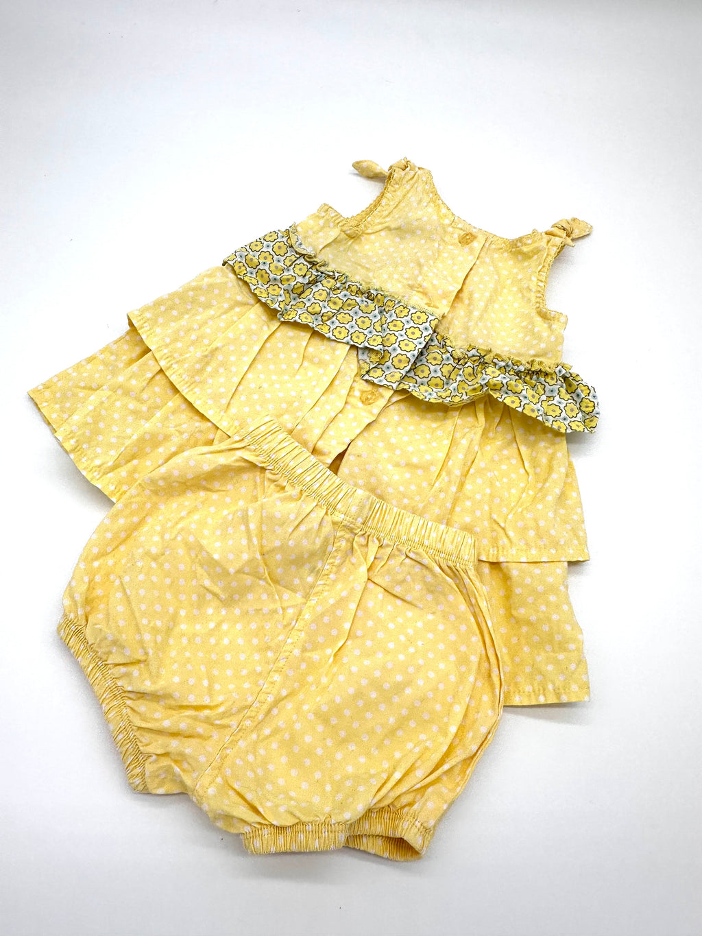 Dieses zuckersüße Set aus luftiger Tunika und passender Bloomershort bringt fröhliche Sommerstimmung in den Kleiderschrank deines Babys. Das feine Tupfenmuster in zartem Gelb und die verspielten Details wie die florale Stickerei machen dieses Outfit zum absoluten Hingucker. Ob für den Ausflug in den Park, den Besuch bei Oma oder einfach für warme Tage zuhause – dein Baby ist mit diesem Set perfekt angezogen.