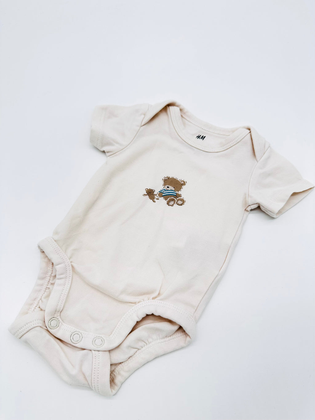 Dieser süße Kurzarm-Body von H&M in zartem Cremeweiß begeistert mit einem niedlichen Teddy-Motiv und besonders weichem Material. Dank Elasthan-Anteil sitzt er angenehm und bietet deinem Baby volle Bewegungsfreiheit – ideal für die ersten Wochen zu Hause oder unterwegs. Praktische Druckknöpfe im Windelbereich erleichtern das An- und Ausziehen.