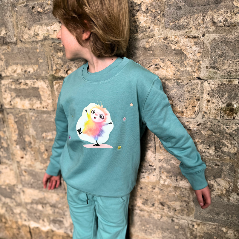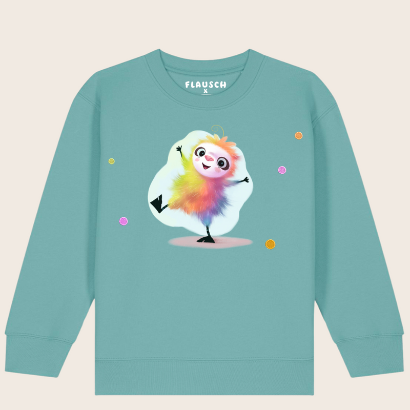 Mit dem türkisfarbenen Sweater wird die Welt von Flausch Teil des täglichen Lebens Eures Kindes. Es trägt die liebevollen Botschaften des Buches mit sich und wird darin bestärkt, dass es genau richtig ist, so wie es ist.