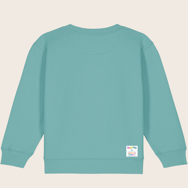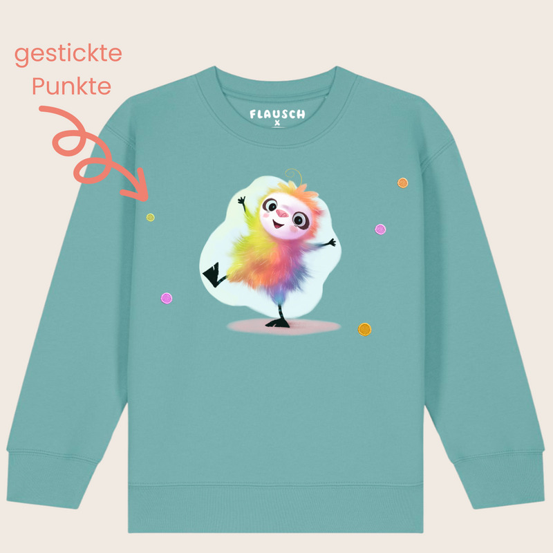 Auf der Fronseite des Sweaters findet sich ein hochwertiger Print von Flausch, der bis zu 70 Wäschen hält. Die bunten Punkte sind gestickt und heben sich optisch leicht ab. Am Saum auf der Rückseite findet sich unser Who said-Markenlabel mit Flausch-Schriftzug.