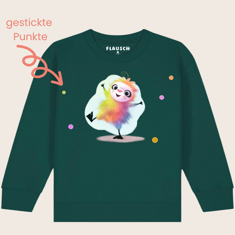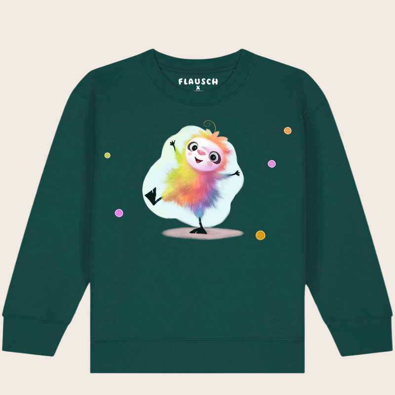 Mit dem dunkelgrünen Sweater wird die Welt von Flausch Teil des täglichen Lebens Eures Kindes. Es trägt die liebevollen Botschaften des Buches mit sich und wird darin bestärkt, dass es genau richtig ist, so wie es ist.
