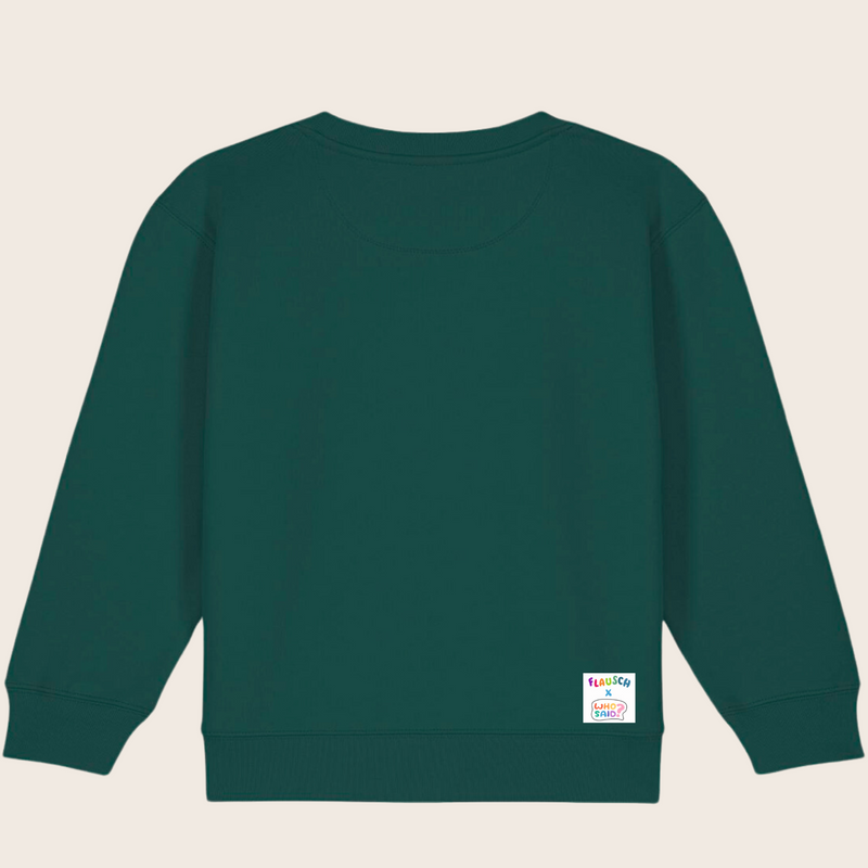Auf der Fronseite des Sweaters findet sich ein hochwertiger Print von Flausch, der bis zu 70 Wäschen hält. Die bunten Punkte sind gestickt und heben sich optisch leicht ab. Am Saum auf der Rückseite findet sich unser Who said-Markenlabel mit Flausch-Schriftzug.