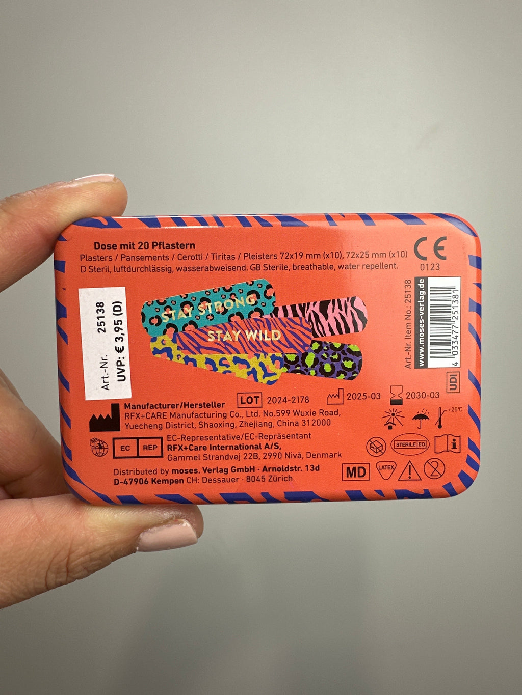 Mit tierischen Mustern und knalligen Farben bringen diese Pflaster gute Laune in jede Hausapotheke. Die dekorative Metallbox enthält 20 Pflaster in zwei Größen – diese sind wasserabweisend und luftdurchlässig und damit stylisch und praktisch zugleich.