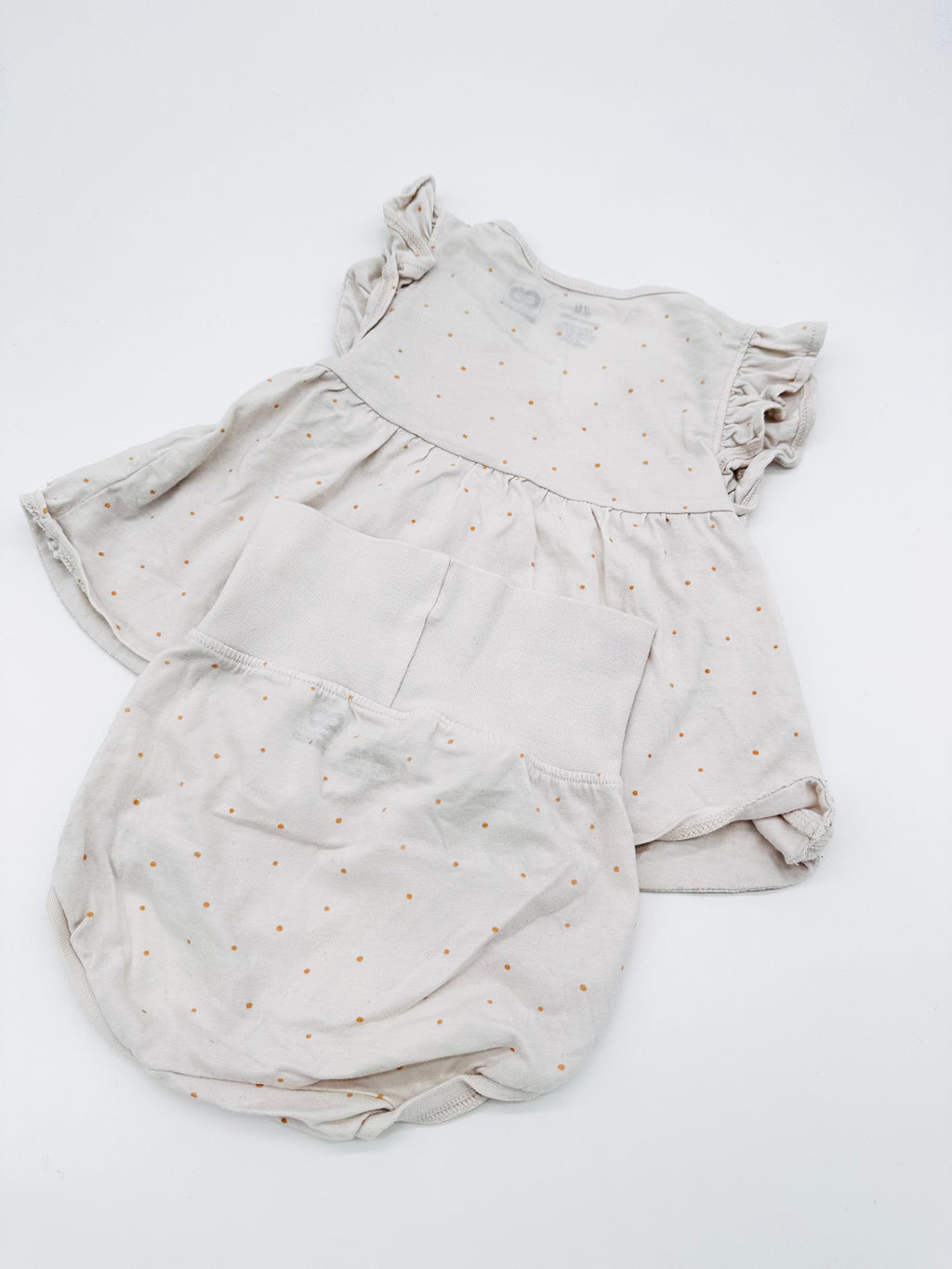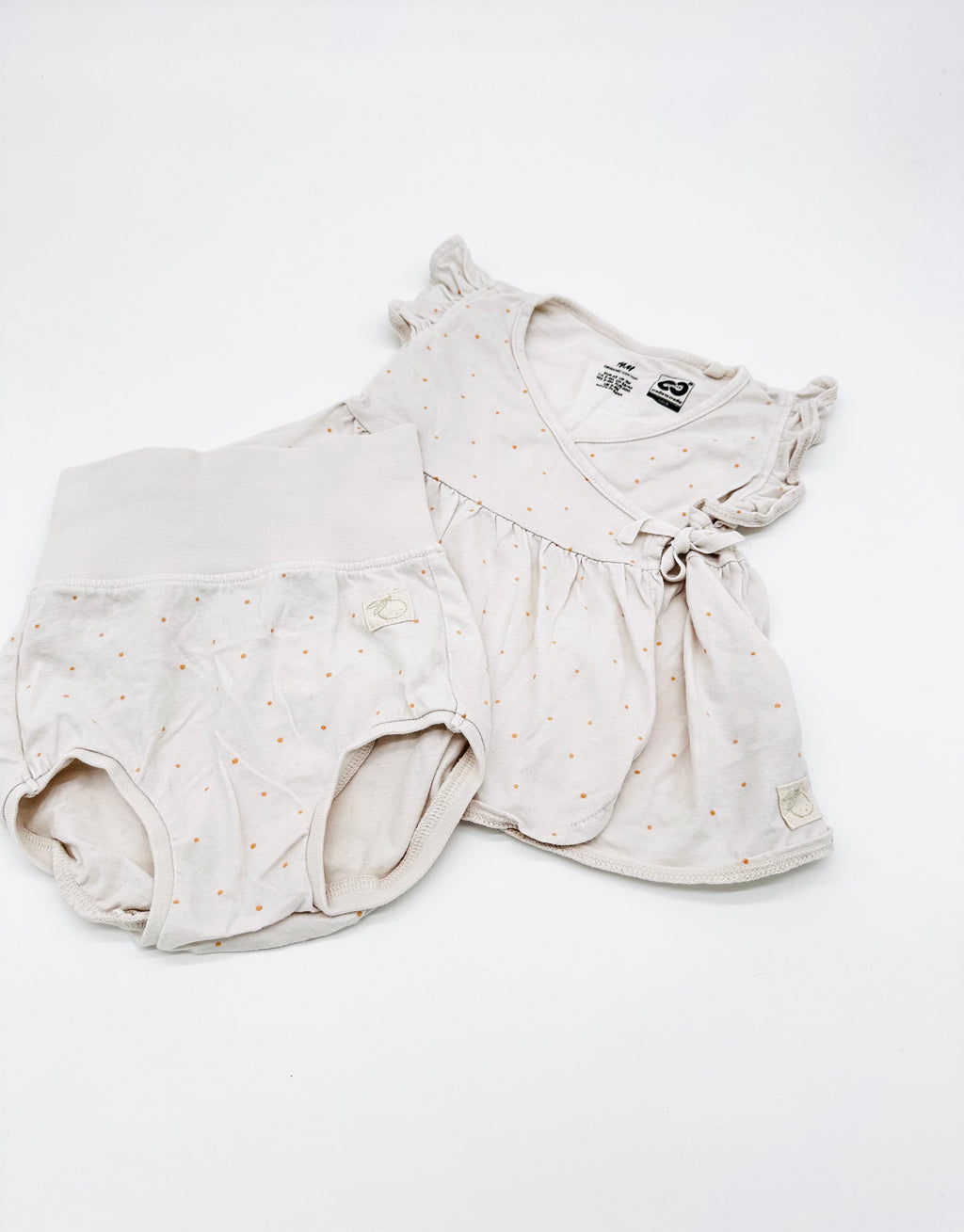Dieses zarte Set in Größe 68 von H&M besteht aus einem süßen Wickelshirt mit feinem Pünktchenmuster und einer passenden Bloomer-Hose. Aus weichem Baumwollmaterial gefertigt, sorgt es für höchsten Tragekomfort – perfekt für warme Tage oder als bequeme Homewear.