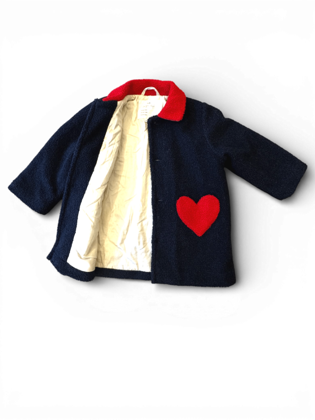 Dieser hochwertige Kinder-Secondhand-Mantel aus weichem Bouclé ist perfekt für kühle Tage. Mit seinem verspielten Design und den freundlichen Farben ist diese Jacke ein echter Blickfang.