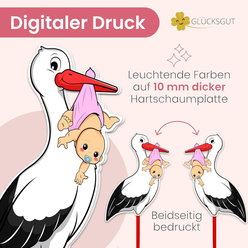 - 💝 KLAPPERSTORCH ZUR GEBURT: Dein Klapperstorch mit Baby ist 88 cm groß und mit einem wunderschönem Motiv auf beiden Seiten in leuchtenden Farben bedruckt, UV-beständig im Sonnenschein, wetterfest bei Regen und auch drinnen im Babyzimmer ein echter Hingucker und einer beschreibbaren Grußkarte – Ein süßes Geburt Geschenk!
