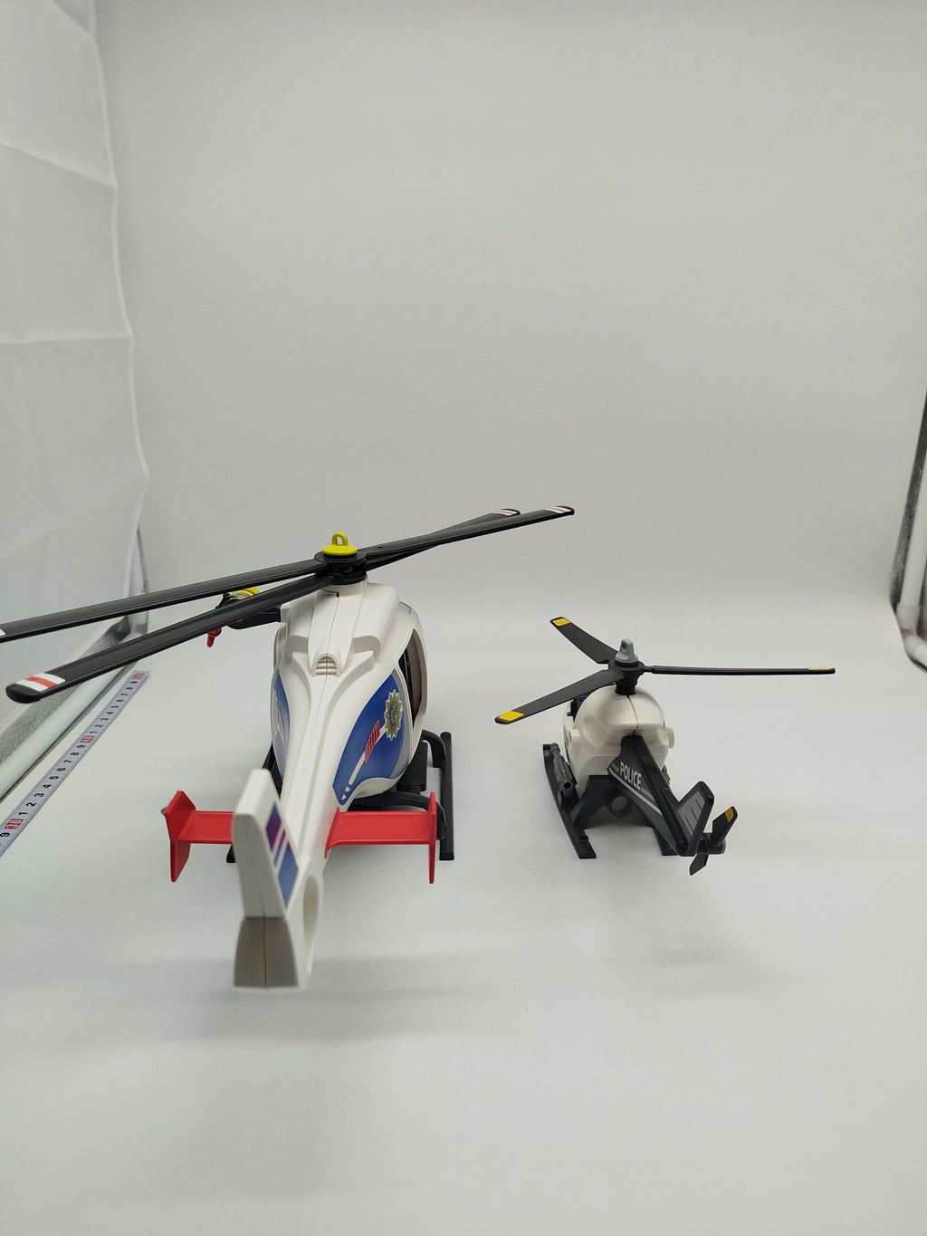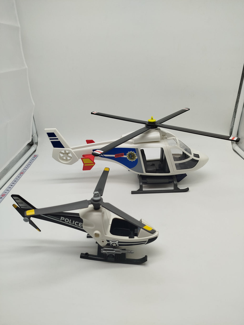 Dieses Set umfasst zwei Polizeihubschrauber der Marke Playmobil. Der große Hubschrauber ist detailreich mit Beleuchtungselementen und Seilen ausgestattet. Beide Fahrzeuge bestehen aus robustem Kunststoff, mit leichten Gebrauchsspuren. Die Vollständigkeit ist nicht gegeben, da Teile aus den Originalsets fehlen. Verpackung und Anleitung sind nicht vorhanden. Hinweis: Enthält Kleinteile, nicht für Kinder unter 3 Jahren geeignet. Gib diesen Hubschraubern ein neues Zuhause und erlebe kreative Abenteuer!