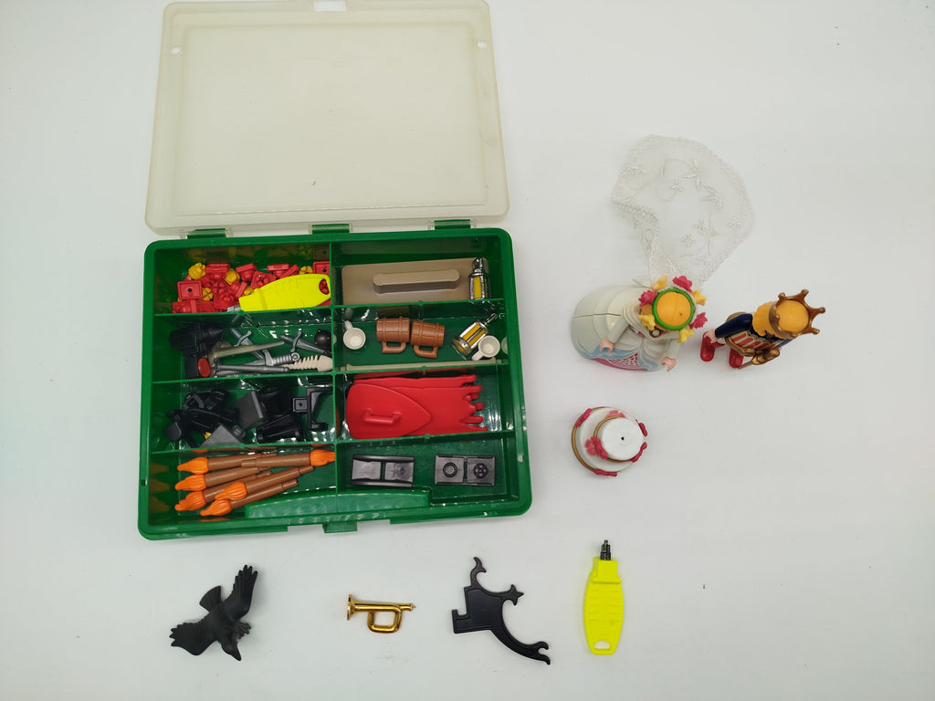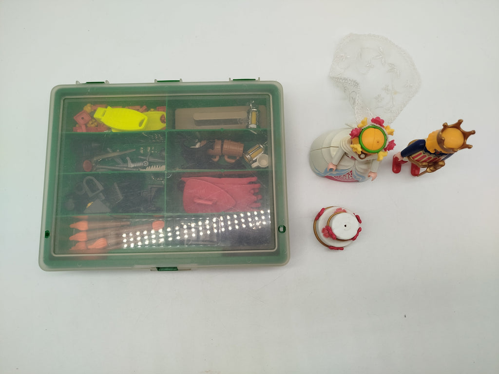 Dieses Playmobil Set enthält einen Sortierkasten und 2 Figuren, die ein Hochzeitspaar darstellen. Zusätzlich gibt es einige Playmobil Accessoires wie Waffen, Schilde und Trinkgefäße, die in einem grünen Sortierkasten praktisch aufbewahrt sind. Die Originalverpackung fehlt, das Set befindet sich jedoch in einem sehr guten Zustand. Das Hochzeitspaar zeigt leichte Gebrauchsspuren. Die Vollständigkeit der Zubehörteile konnte nicht überprüft werden. Dieses Spielzeug eignet sich ideal für Rollenspiele rund um Hochzeit und Ritterzeit. Hinweis: Enthält Kleinteile, nicht für Kinder unter 3 Jahren geeignet. Gib diesem Spielzeug ein neues Zuhause und erlebe stundenlangen Spielspaß!