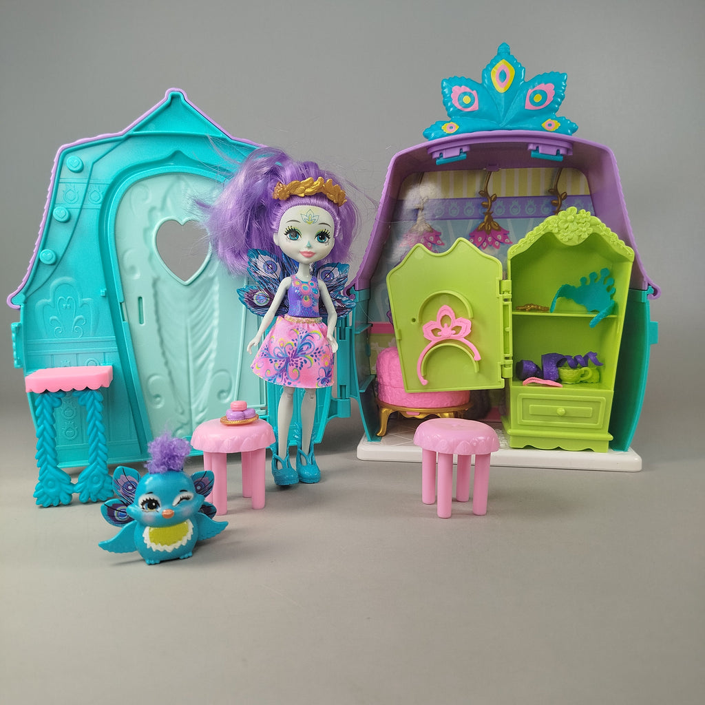 Hol dir das zauberhafte Patter Peacock Haus Spielset von Mattel und tauche ein in eine fantasievolle Enchantimals-Welt! Dieses liebevoll gestaltete Puppenhaus lässt sich aufklappen und zeigt einen gemütlichen Wohnraum in Türkis- und Lilatönen. Enthalten sind genau zwei Figuren: eine Enchantimals-Puppe mit lila Haaren und pfauenähnlichen Flügeln sowie ihr blauer Pfauen-Tierfreund. Zum Spielset gehören außerdem ein Schminktisch mit Spiegel, ein pinker Hocker, ein grüner Kleiderschrank, ein Tisch, eine Sitzstange, zwei kleine pinke Sitzgelegenheiten sowie kleines Zubehör wie eine Bürste und eine Flasche, die im Schrank untergebracht sind. Das Spielzeug eignet sich ideal für fantasievolle Rollenspiele und fördert kreatives Erzählen im Kinderzimmer. Gib diesem gebrauchten Spielzeug ein neues Zuhause und schenk ihm ein zweites Leben. Der Artikel ist gebraucht. Eine Originalverpackung ist nicht vorhanden. Die Vollständigkeit konnte nicht überprüft werden, der Lieferumfang entspricht der Beschreibung. Sicherheitshinweis gemäß GPSR: Enthält Kleinteile, nicht geeignet für Kinder unter 3 Jahren – Erstickungsgefahr!