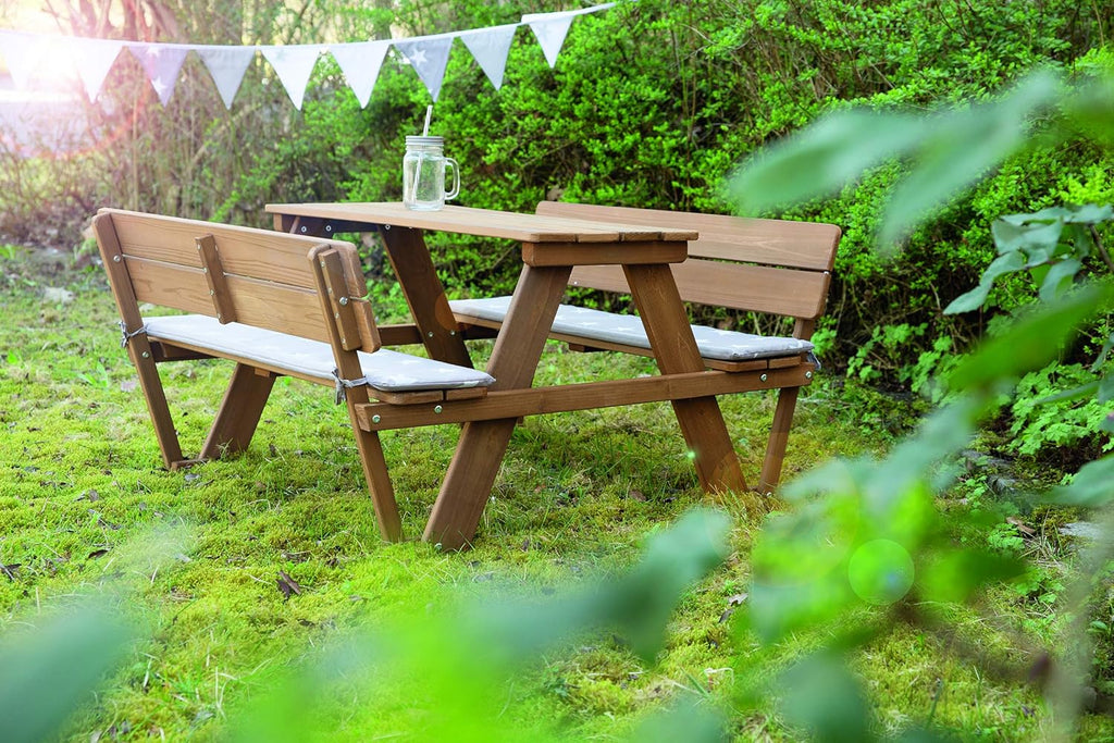 Produktbeschreibung Mit der roba Kinder Outdoor Sitzgruppe Picknick for 4 Outdoor + mit Rückenlehne aus hochwertigem, Massivholz wird die nächste Feier auch für die Kids ein Hit – sowohl draußen im Garten, auf der Terrasse als auch drinnen. Die wetterfeste, robuste, Sitzgarnitur in Teakholz-Optik mit praktischer Rückenlehne ist mit 27 cm Sitzhöhe kindgerecht konstruiert, besonders langlebig und bietet Platz für bis zu 4 Kinder. Die abgerundeten Ecken des Spieltischs und die stabile Konstruktion sorgen für optimale Sicherheit. Die Tischplatte (LxB: 89 x 35 cm) lädt zum Picknicken, Malen, Basteln und Spielen ein. Die Bänke und der Tisch der Sitzgruppe sind miteinander verbunden, dadurch ist sie sehr stabil und kippsicher. Zudem bietet die Sitzgarnitur keine Klemmpunkte, die kleinen Kinderfingern schaden können. Die Kinder Outdoor Sitzgruppe ist pro Bank und Tischplatte mit je 50 kg belastbar. Die schutzrechtlich angemeldete Kindersitzgruppe kann mit praktischen Accessoires aus unserem Outdoor-Sortiment ergänzt werden und ist sowohl im Garten, auf der Terrasse oder im Haus ein Highlight. Die Kinder Outdoor Sitzgruppe aus Massivholz wird zerlegt geliefert. Die übersichtliche Aufbauanleitung ermöglicht eine einfache Selbstmontage. Alle verwendeten Materialien sind schadstoffgeprüft und zertifiziert. Zusätzlich werden sie regelmäßig während der Herstellung überprüft. Die Oberflächen der umweltfreundlichen und vielseitigen roba Kinder Outdoor Sitzgruppe Picknick for 4 Outdoor + sind pflegeleicht und abwaschbar. Die Aufbaumaße der Garnitur betragen (HxBxT): 50,5 x 107 x 89 cm. Für Kinder ab 12 Monaten. Bei der gesamten roba Outdoor + Kollektion wurde besonderes Augenmerk auf die stabile Konstruktion gelegt. Alle Outdoor + Produkte bestehen aus robustem Massivholz. Die Outdoor + Kollektion ist wetterbeständig und besonders langlebig. Warnhinweise Achtung: Dieses Produkt besteht aus massivem Holz, bitte überprüfen Sie es regelmäßig auf Splitter oder beschädigte Teile. Von Feuer fernhalten.