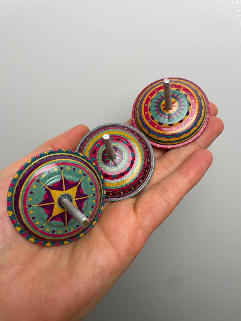 Bunt gemischte Hüpfkreisel mit Sprungfeder. Dreht man sie, hüpfen sie fröhlich auf und ab. Schön bedruckt in verschiedenen Designs. Verpackt im Verkaufsdisplay.