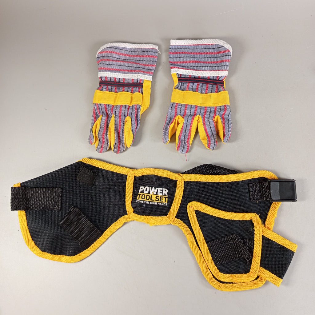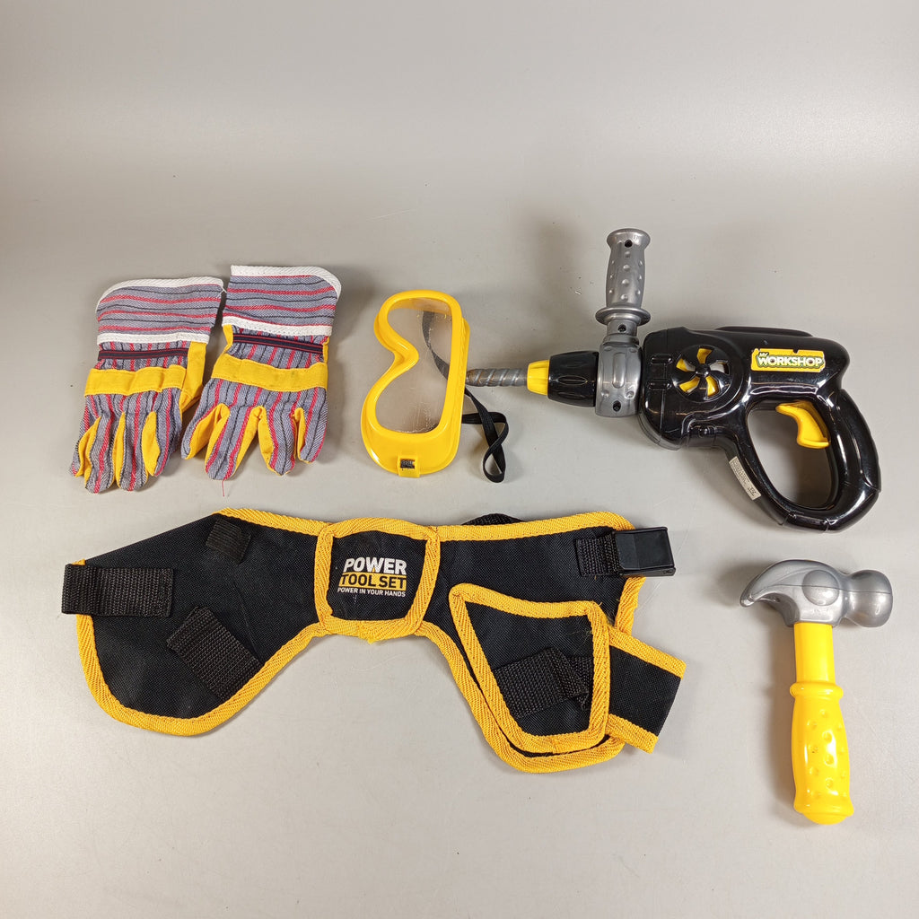 Hol dir das MY WORKSHOP Werkzeug-Set für kleine Handwerkerinnen! Dieses 5-teilige Spielset enthält eine schwarze und gelbe Spielzeugbohrmaschine mit sichtbaren mechanischen Komponenten, einen Hammer, Schutzbrille, Handschuhe und einen Stoff-Werkzeuggürtel. Ideal für kreative Rollenspiele und technikbegeisterte Kinder. Verpackung fehlt, das Set ist jedoch in sehr gutem gebrauchten Zustand und bietet viele Stunden Spielspaß. Bitte beachte: Wegen Kleinteilen nicht für Kinder unter 3 Jahren geeignet – gib diesem Werkzeugset ein neues Zuhause und fördere spielerisch Geschick und Fantasie!