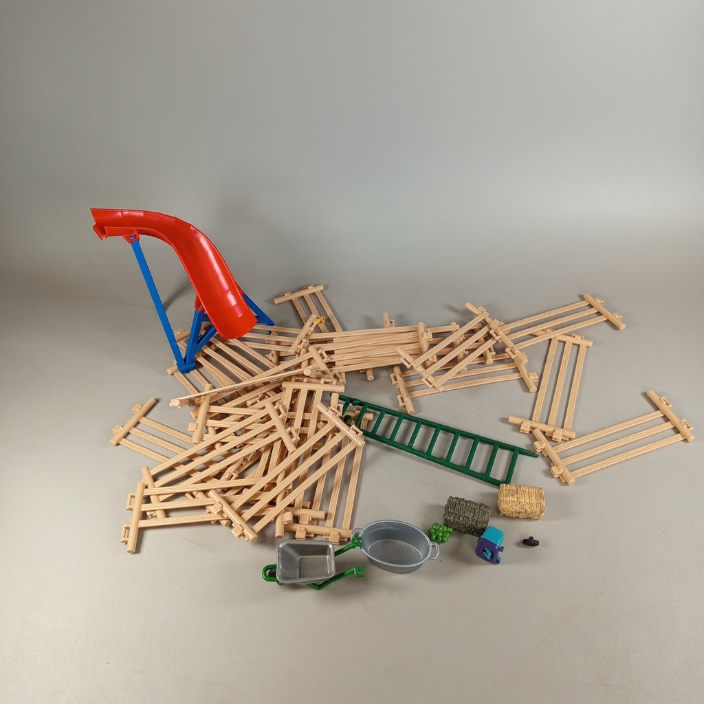Hol dir das Schleich Tierspielset mit Stall, Zaunelementen, Rutsche und Futterzubehör. Enthalten sind 17 figuren wie Pferde, Hund, Kuh und Vögel menschliche Figuren. Perfekt für fantasievolles Rollenspiel rund um den Bauernhof. Das Set ist gebraucht und in sehr gutem Zustand, Verpackung fehlt. Die Vollständigkeit konnte nicht überprüft werden. Sicherheitshinweis: Nicht für Kinder unter 3 Jahren geeignet, da Kleinteile verschluckt werden können.