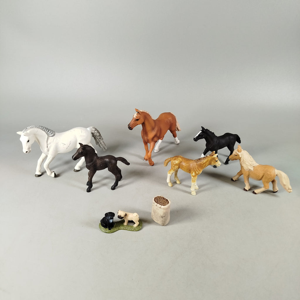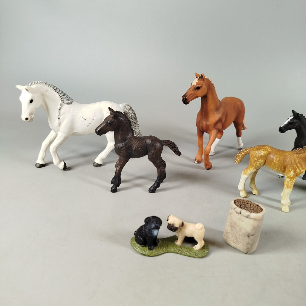 Hol dir das detailreiche Tierset mit 8 Figuren, darunter 2 Pferde, 4 Fohlen, 2 Hunde und 1 Zubehörteil. Fünf Figuren sind originale Schleich-Tiere, die übrigen stammen von anderen Marken. Perfekt für kleine Tierliebhaber und fantasievolles Spiel. Das Spielzeug ist gebraucht und befindet sich in einem sehr guten Zustand. Verpackung fehlt. Gib diesen schönen Figuren ein neues Zuhause und schenk ihnen eine zweite Spielrunde! Hinweis: Enthält Kleinteile, nicht für Kinder unter 3 Jahren geeignet.