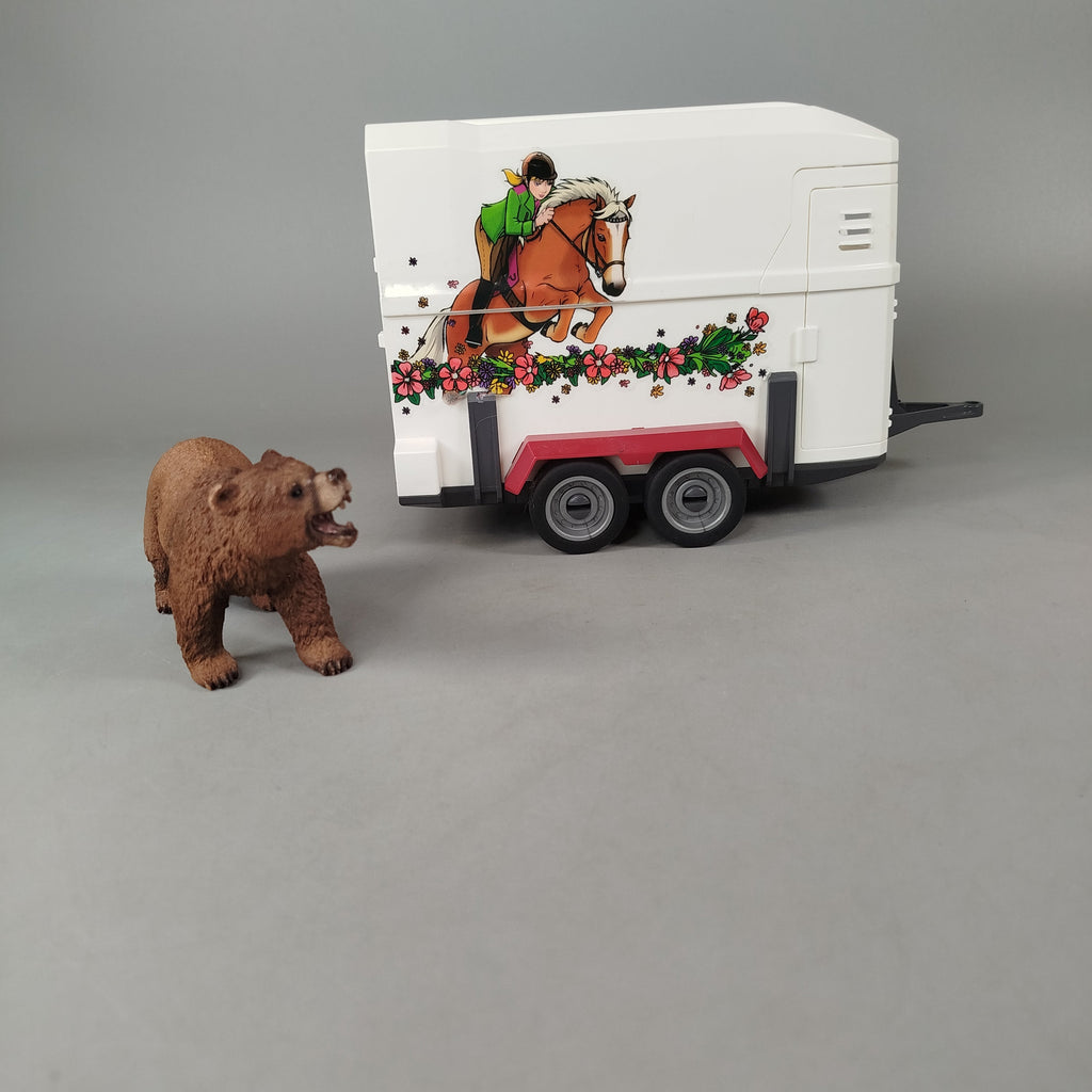 Hol dir das Figuren-Set mit einem weißen Pferdeanhänger und einer Schleich Bärenfigur. Der Anhänger zeigt ein Reitmotiv und eignet sich ideal für fantasievolles Spielen rund um das Thema Tiere. Gib diesem Set ein neues Zuhause und erweitere deine Sammlung. Der Artikel ist gebraucht und befindet sich in einem sehr guten Zustand. Die Vollständigkeit konnte nicht überprüft werden. Verpackung fehlt. Sicherheitshinweis: Nicht für Kinder unter 3 Jahren geeignet, da Kleinteile verschluckt werden können.